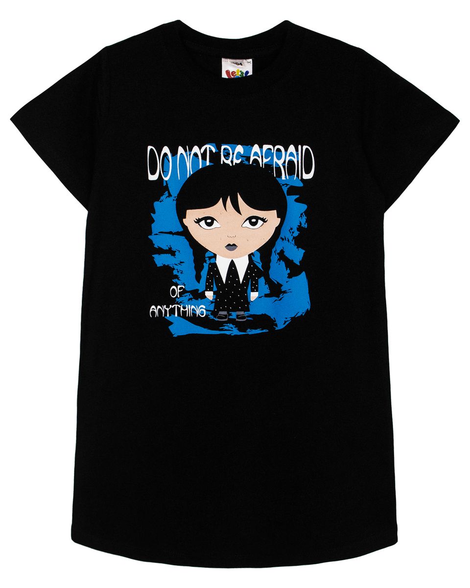Платье для девочки прямого силуэта, с втачным коротким рукавом. Горловина круглая, обработана воротником из рибаны. Горловина спинки внутри укреплена бейкой из кулирки. По горловине полочки отделочная строчка. Низ изделия и низ рукавов обработан швом в подгибку. На полочке принт шелкография. Надпись переводится как "Ничего не бойся".