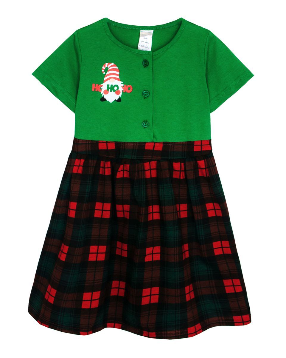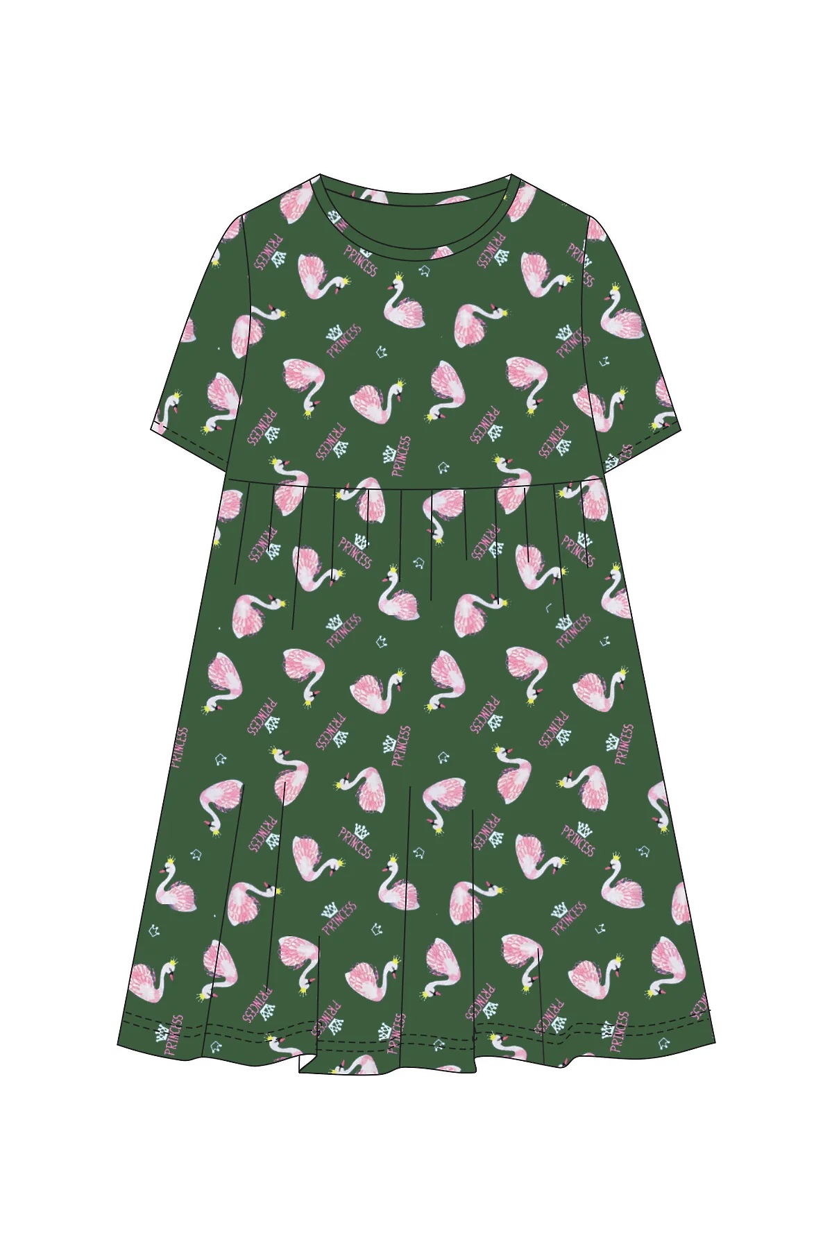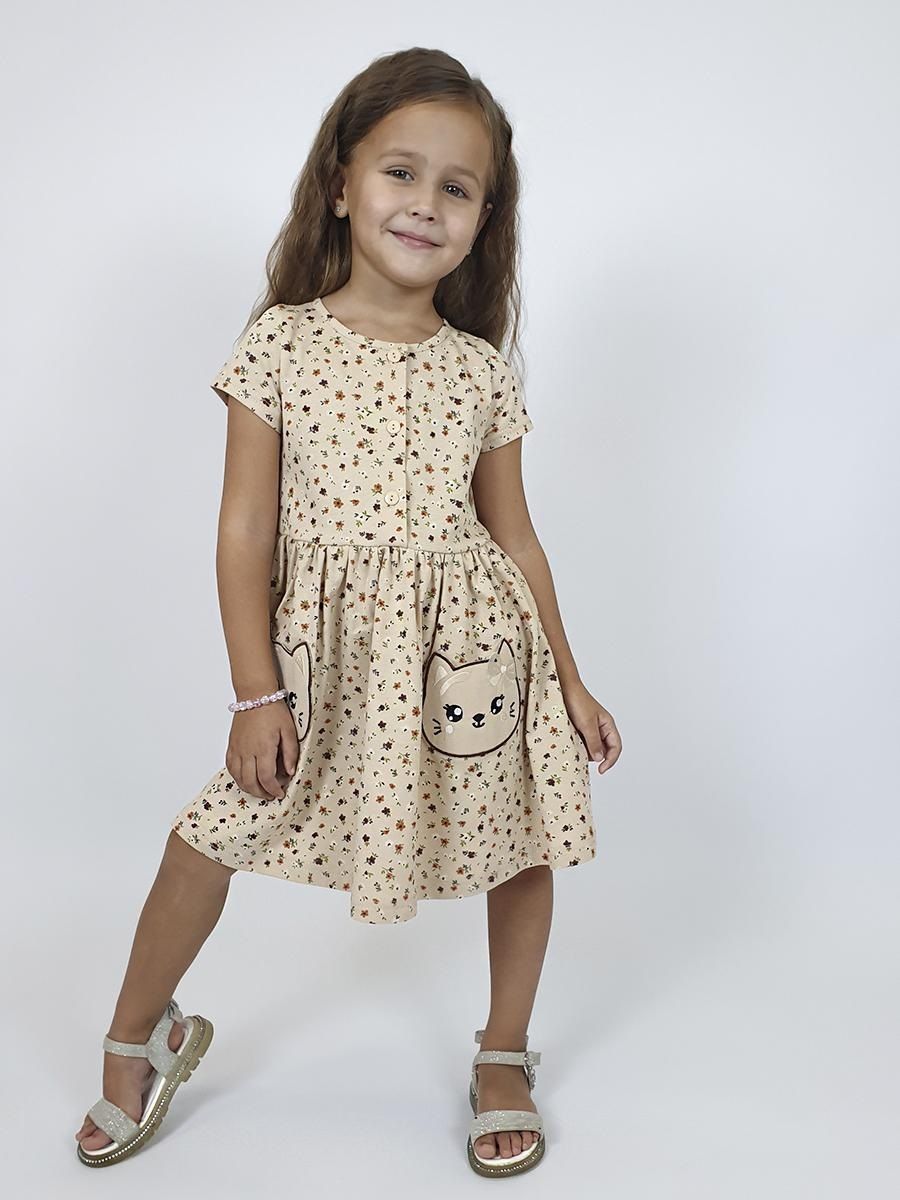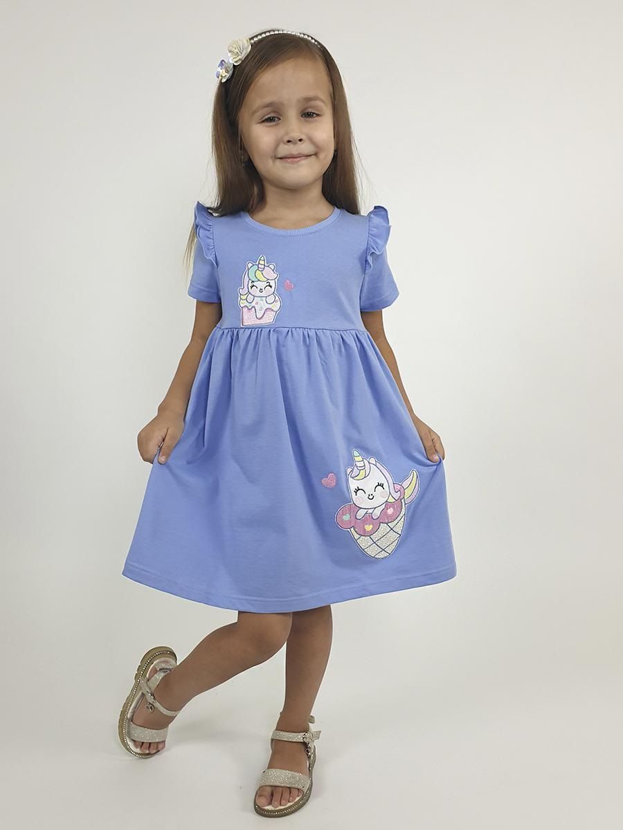 Платье для девочки приталенного силуэта, отрезное по линии талии. Лиф полочки, спинки, рукав из однотонного полотна. Горловина круглая, окантовка из кулирки. Рукава в тачной короткий, низ рукава обработан швом в подгибку. На полочке цельнокроенная планка, с 4 пуговицами прорезными петлями, нитки в цвет изделия. По линии талии отрезной пояс и юбка, из набивного полотна. Юбка полусолнце, со сборкой по талии, низ обработан швом в подгибку. На полочке слева принт шелкография.
