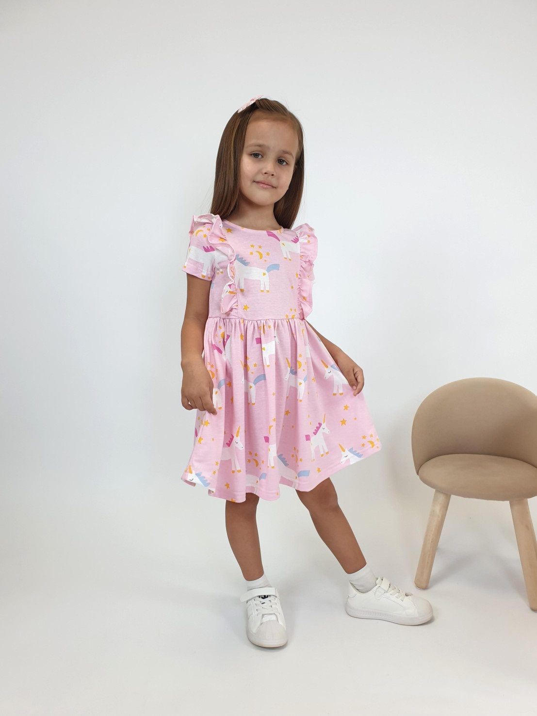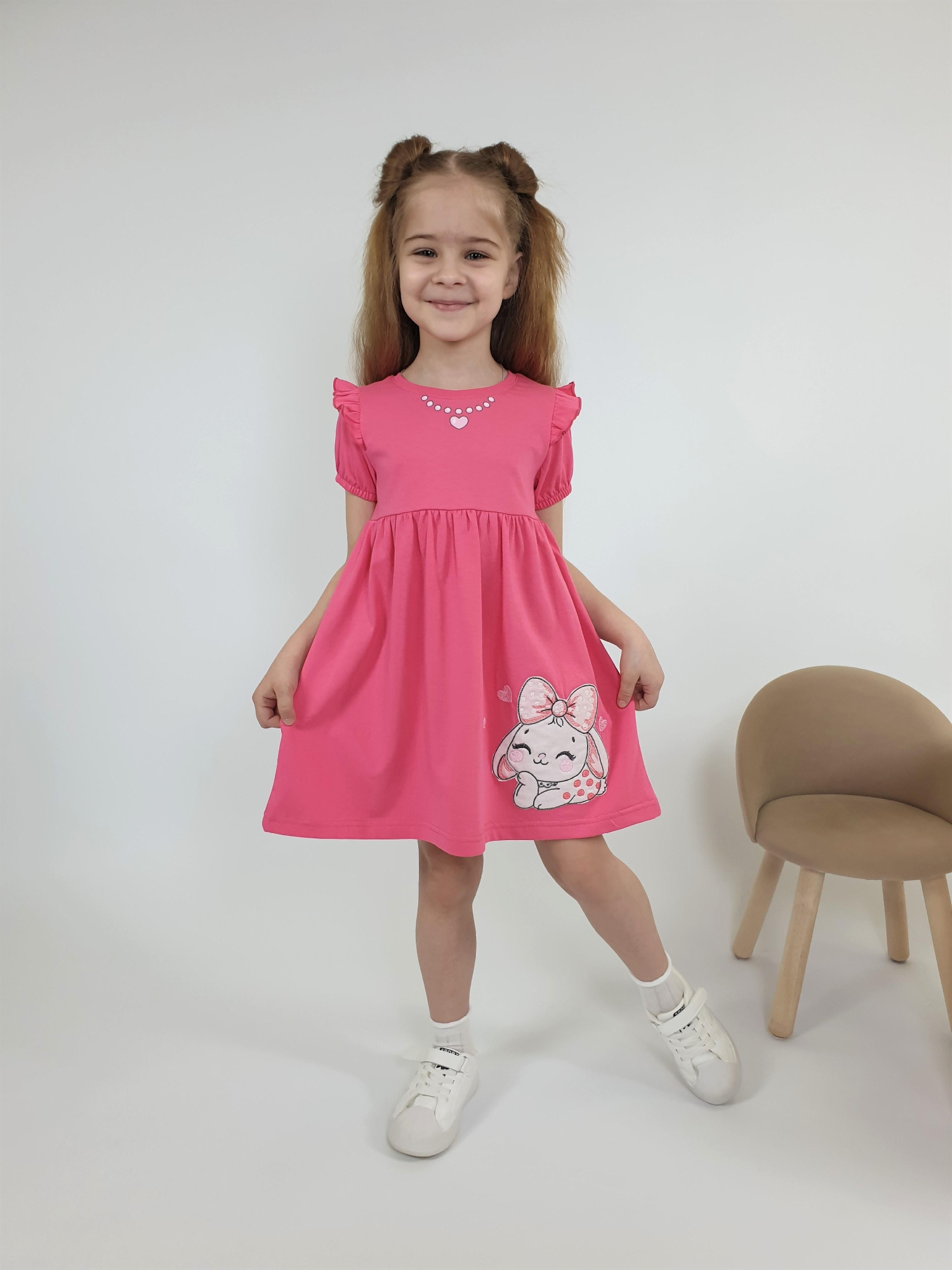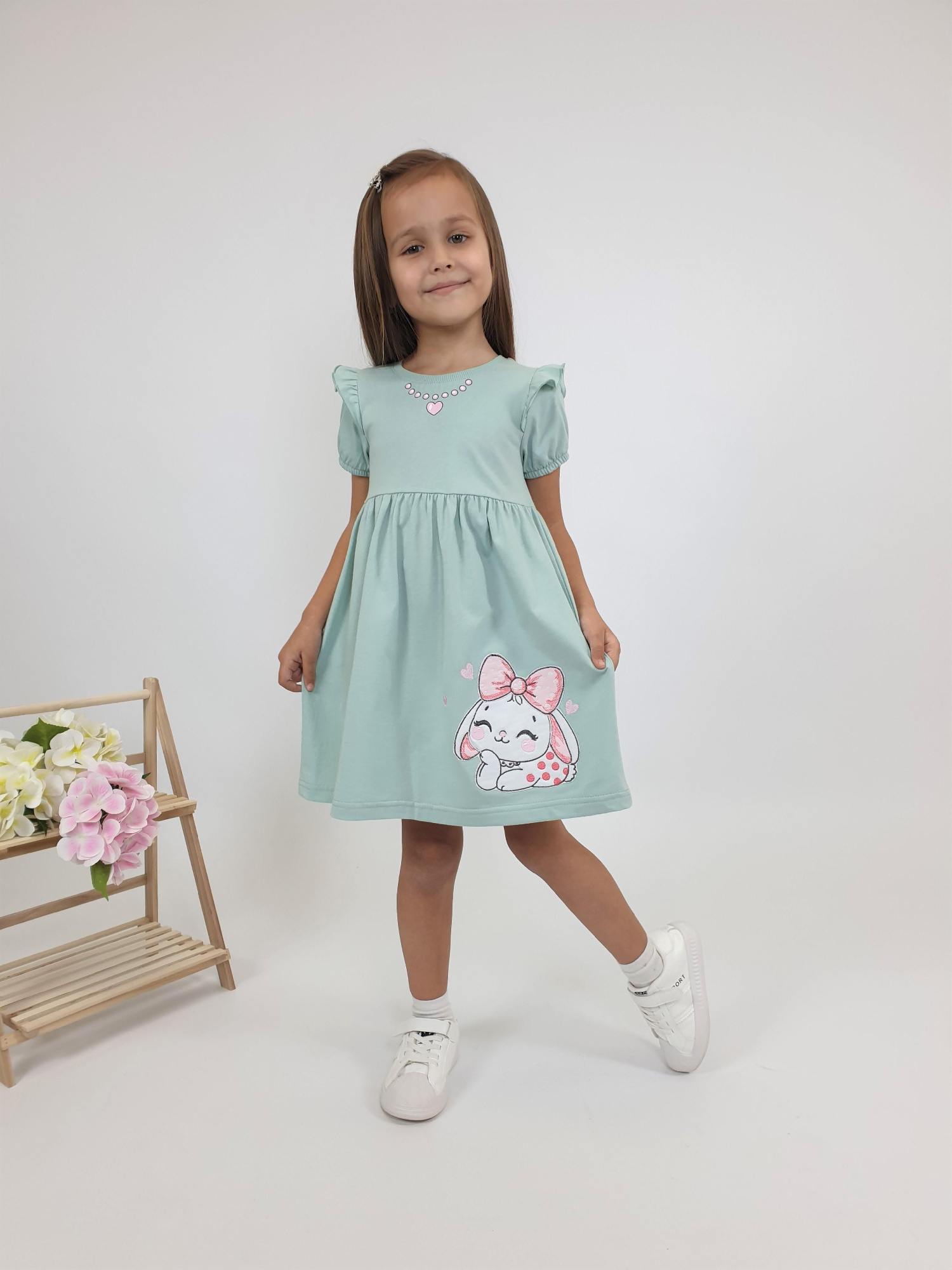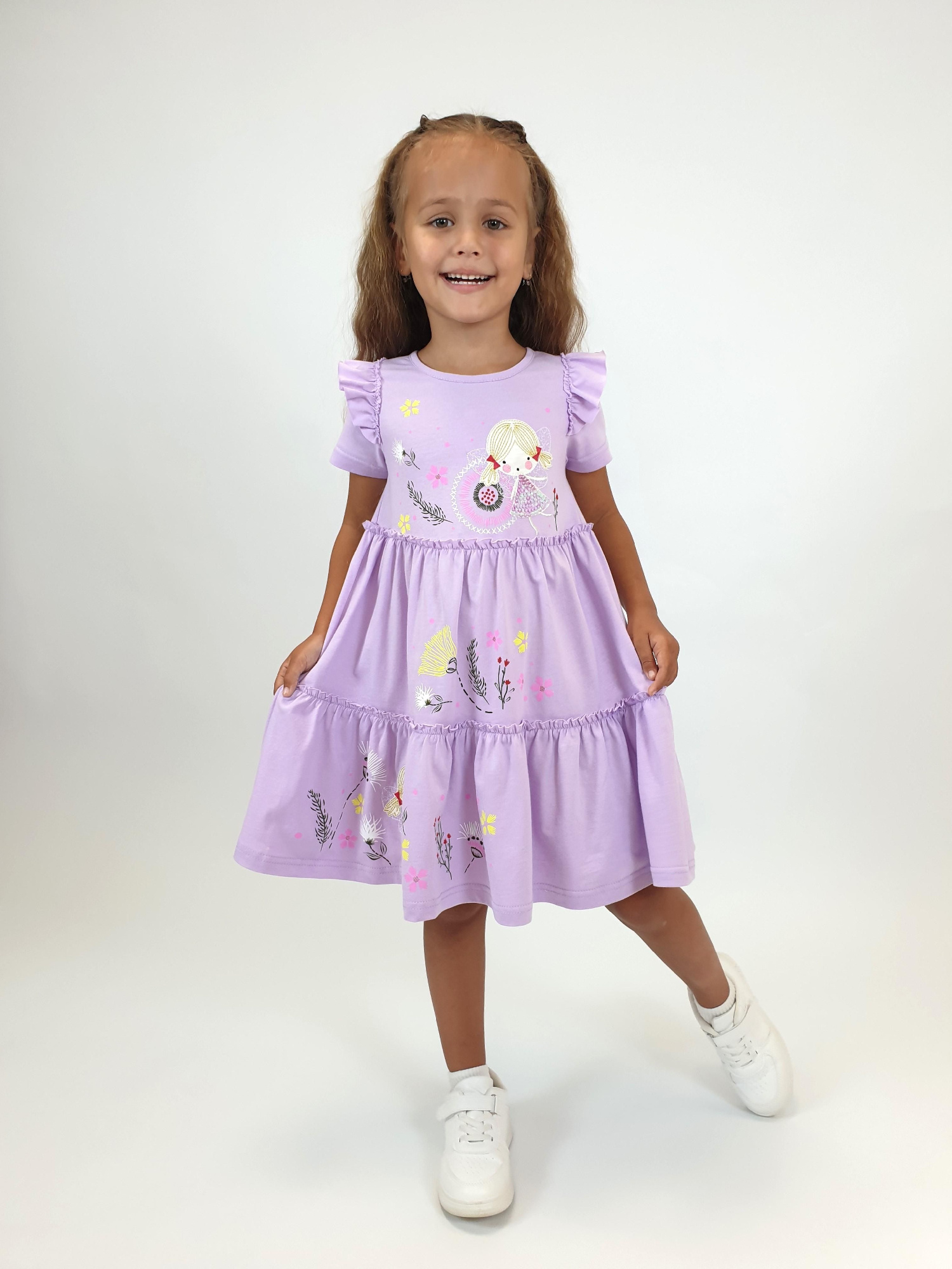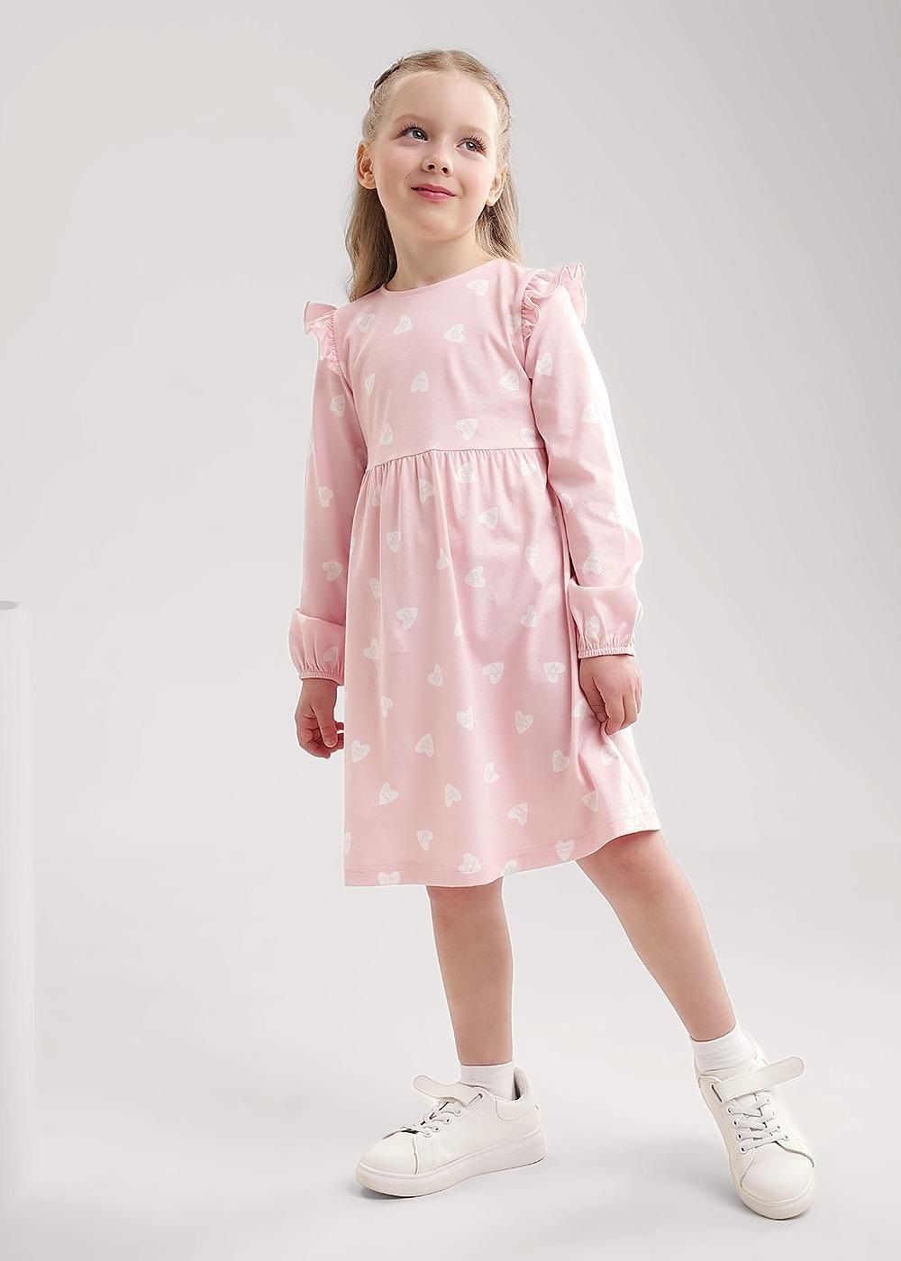 Платье А-силуэта для девочки из гладкокрашенной кулирки. На полочке принт (шелкография). Платье умеренного объема, с воланом со сборкой по низу. У платья длинный втачной рукав. Округлый вырез горловины обработан бейкой из основного полотна.