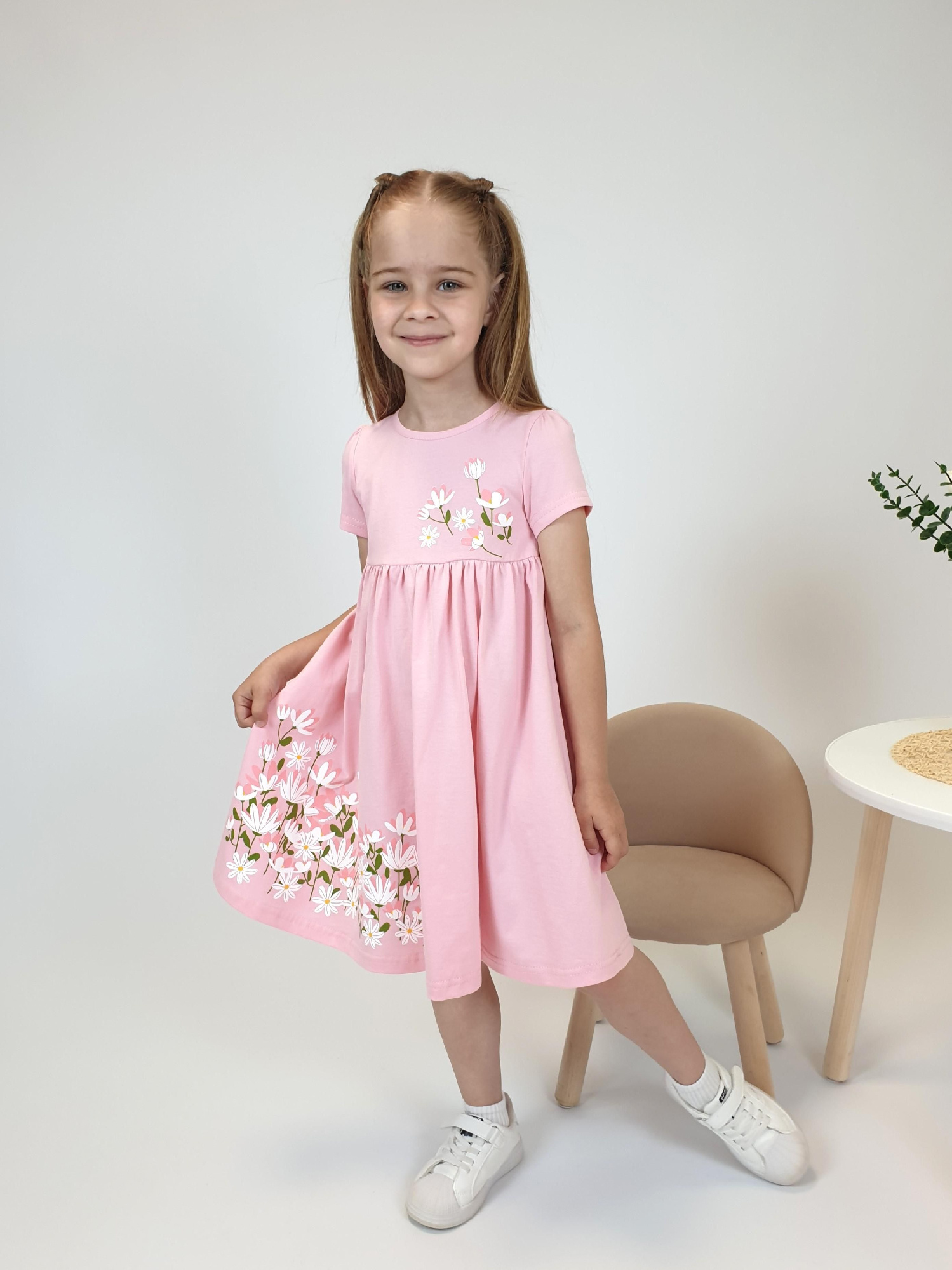 Милое романтичное платье из хлопкового трикотажа в набивку- то, что нужно для создания классного повседневного образа! Модель с пышной юбкой и декоративным воротничком идеально дополнит твой гардероб. Создавай стильные повседневные образы и будь в тренде