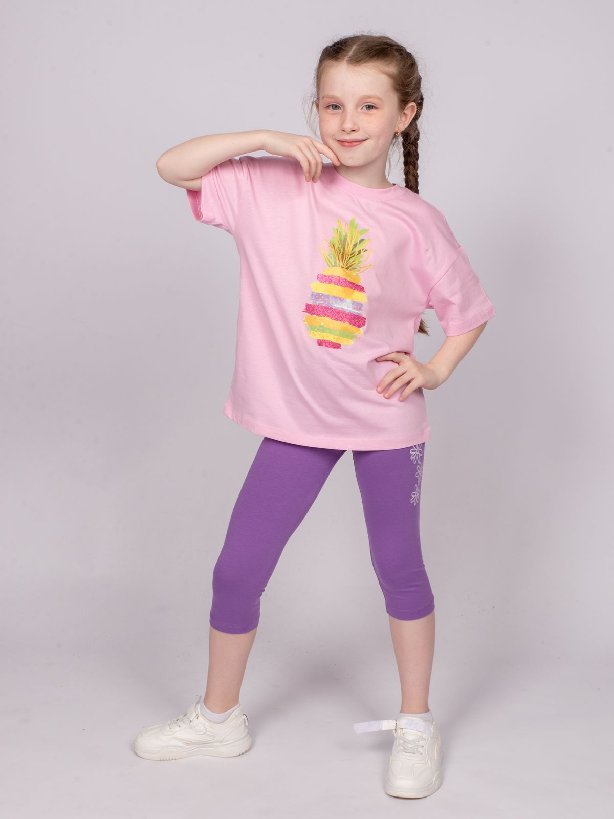 Бриджи для девочки прилегающего силуэта из гладкокрашеного полотна. Пояс цельнокроенный, с эластичной тесьмой внутри, закрепленной в шов. Низ бридж обработан швом в подгибку. На передней половинке бридж принт радужный глиттер.