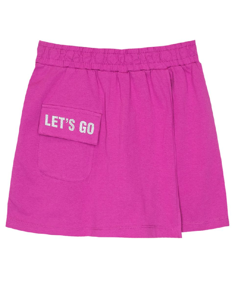 Шорты для девочки прямого силуэта из кулирки с накладным карманом. Пояс отрезной в цвет изделия, выполнен из основного полотна, с эластичной тесьмой внутри. В передней части изделия расположена отлётная часть – имитация запаха, из основного полотна. На отлетной части запаха выполнен накладной карман с клапаном из основного материала. На клапане принт шелкография с глиттером. Низ изделия и отлетная часть запаха обработан швом в подгибку. Надпись переводится как "Вперед".