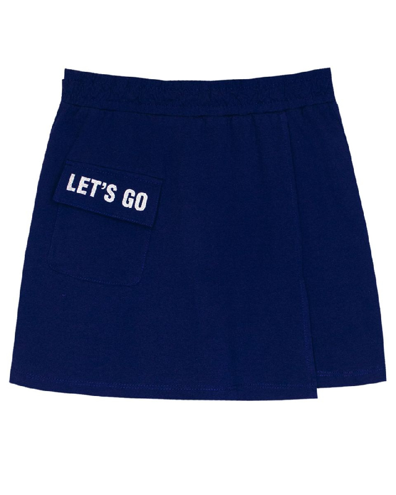 Шорты для девочки прямого силуэта из кулирки с накладным карманом. Пояс отрезной в цвет изделия, выполнен из основного полотна, с эластичной тесьмой внутри. В передней части изделия расположена отлётная часть – имитация запаха, из основного полотна. На отлетной части запаха выполнен накладной карман с клапаном из основного материала. На клапане принт шелкография с глиттером. Низ изделия и отлетная часть запаха обработан швом в подгибку. Надпись переводится как "Вперед".