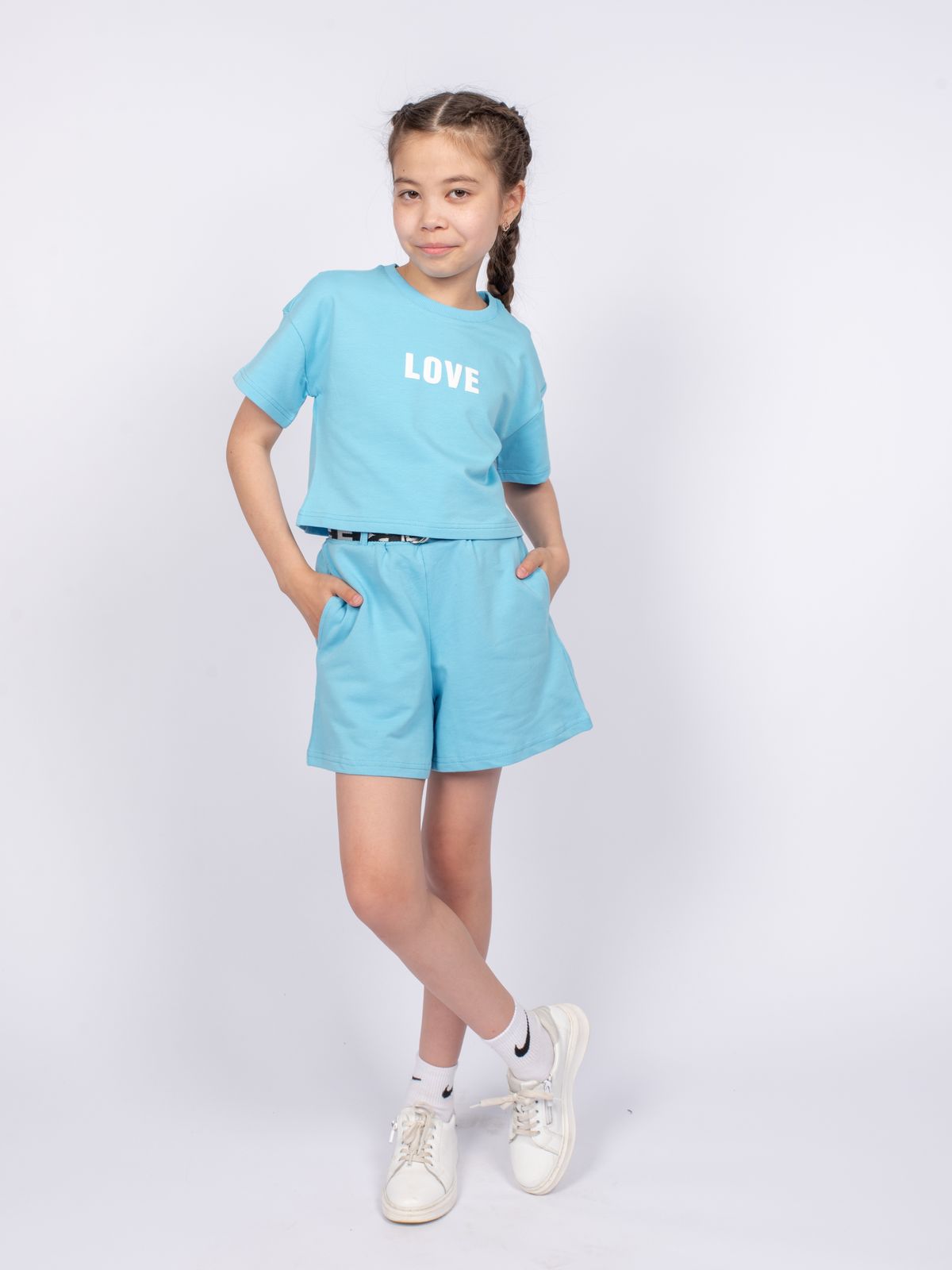 Шорты для девочки трапецевидного силуэта. Пояс отрезной выполнен из основного полотна в цвет изделия, с эластичной тесьмой внутри. По поясу 3 шлевки из основного полотна. По поясу текстильный ремень с двумя металлическими кольцами. В боковых швах выполнены карманы с листочкой. Низ изделия обработан швом в подгибку.