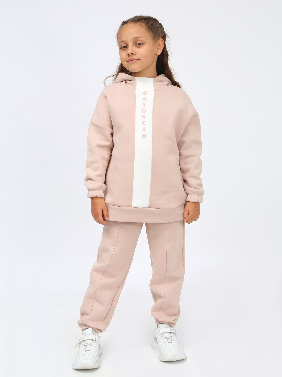 Костюм из толстой ткани с начесом 2х расцветок. Толстовка свободного силуэта, удлиненная на поясе и с капюшоном. Рукав со спущенным плечом с цельнокроенной манжетой на резинке. Полочка имеет вертикальную вставку из отделочной ткани, Украшенную шелкографией. Капюшон стойка, которая выполнена из ткани такой же расцветки, что и вставка полочки. Брюки свободные, внизу на манжетах с резинкой. Для украшения передние половинки имеют вертикальный разрез. Ткань хорошо пропускает воздух и удерживает тепло.