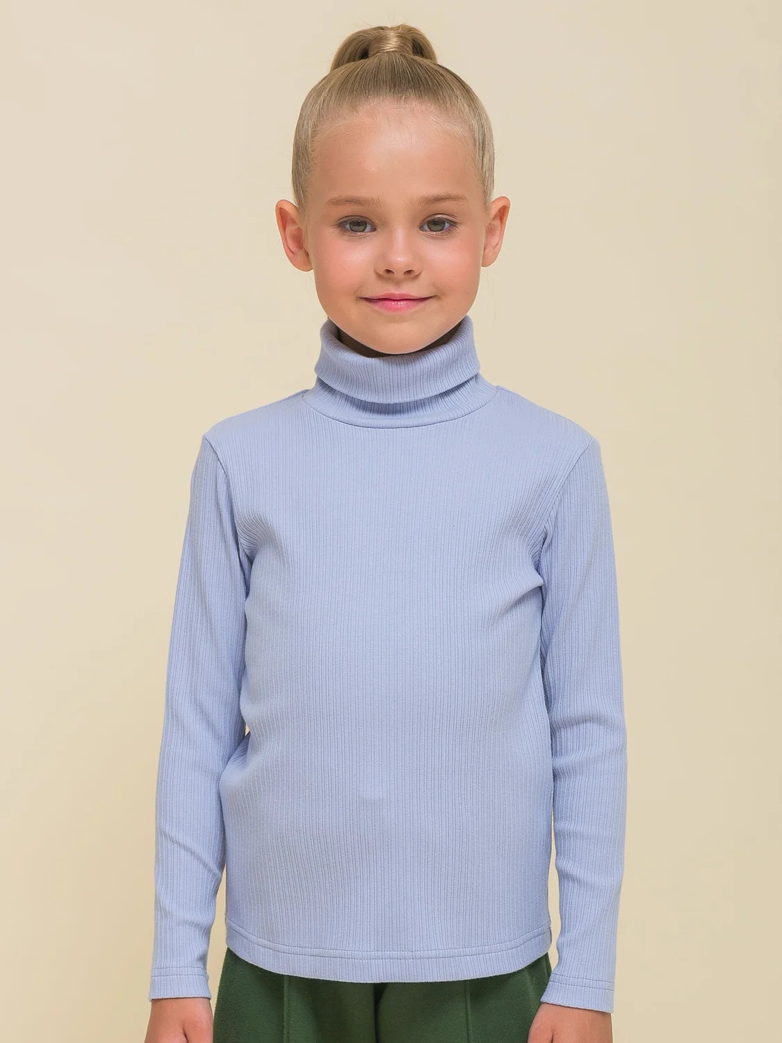 Водолазка в рубчик для девочки. Материал в рубчик (кашкорсе) — один из модных трендов. Джемпер умеренного объема со спущенным плечом подарит ребёнку комфорт и свободу движений. Водолазка-лапша с высоким воротником-стойкой защищает шею от холода и ветра — можно не надевать дополнительно шарф. Изделие однотонное, без принта.