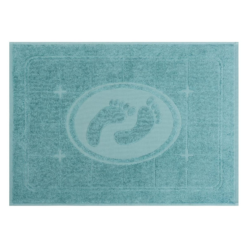 Полотно: махра. Размер: 50х70 Состав: 100% хлопок. Плотность 650 г/м². Дизайн: лаконичный коврик выполнен в стиле ретро с простыми линиями и утрированным рисунком. Одноцветное махровое полотно декорировано рельефной композицией в виде керамической плитки и отпечатков ног.