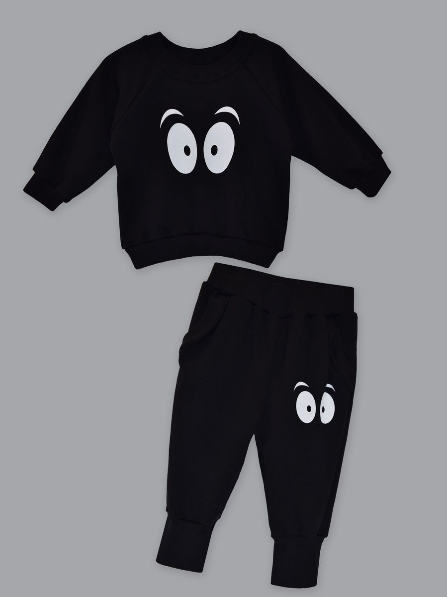 Стильный комплект для маленьких модников. Кофточка с длинным рукавом-реглан, с манжетами. Штанишки на широкой резинке, с карманами. На кофточке и на штанишках забавный принт "глазки".