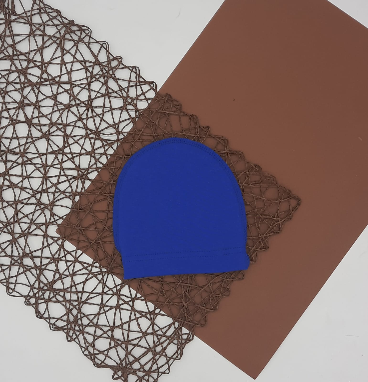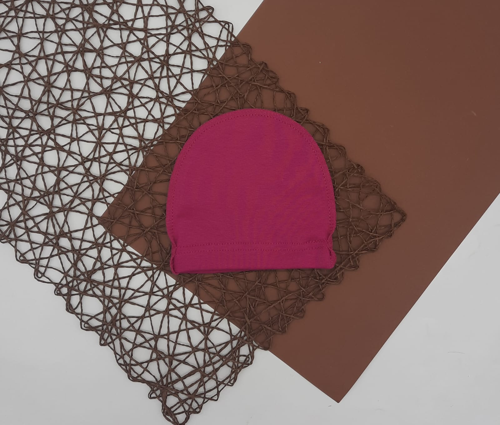 Эластичная шапочка, швы наружу. Прекрасно тянется и облегает головку, очень мягкая и безопасная.