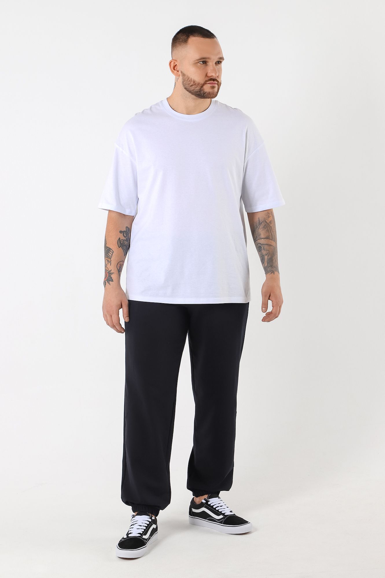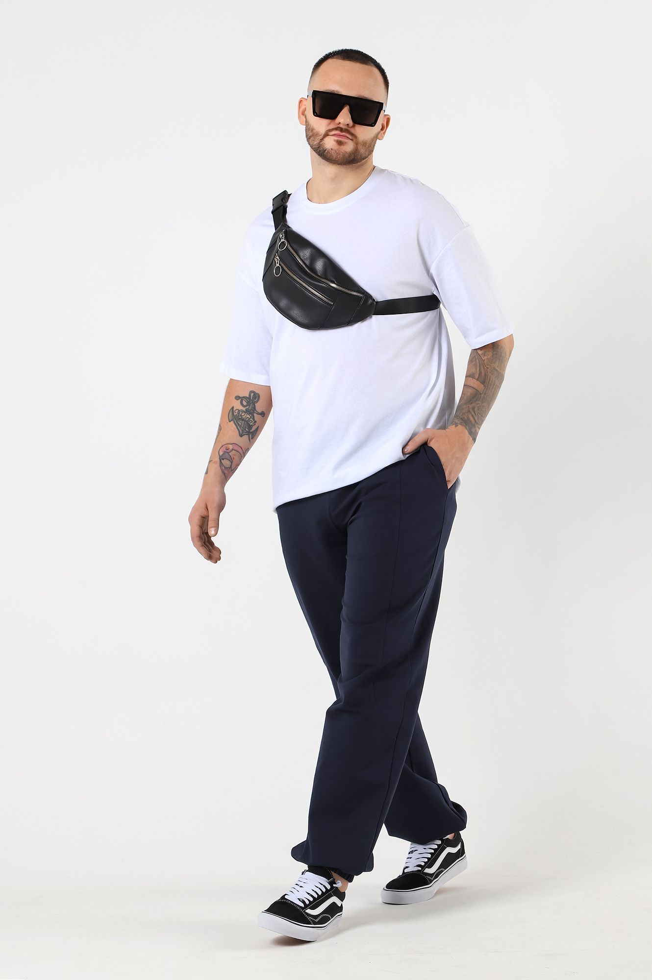 Брюки мужские изгладкокрашеного полотна "футер-двунитка", на притачном поясе с эластичной тесьмой внутри и карманами в боковых швах. Средние половинки - из двух частей каждая, с отделочными строчками по швам стачивания. Нижние срезы обработаны подгибкой с эластичной тесьмой.