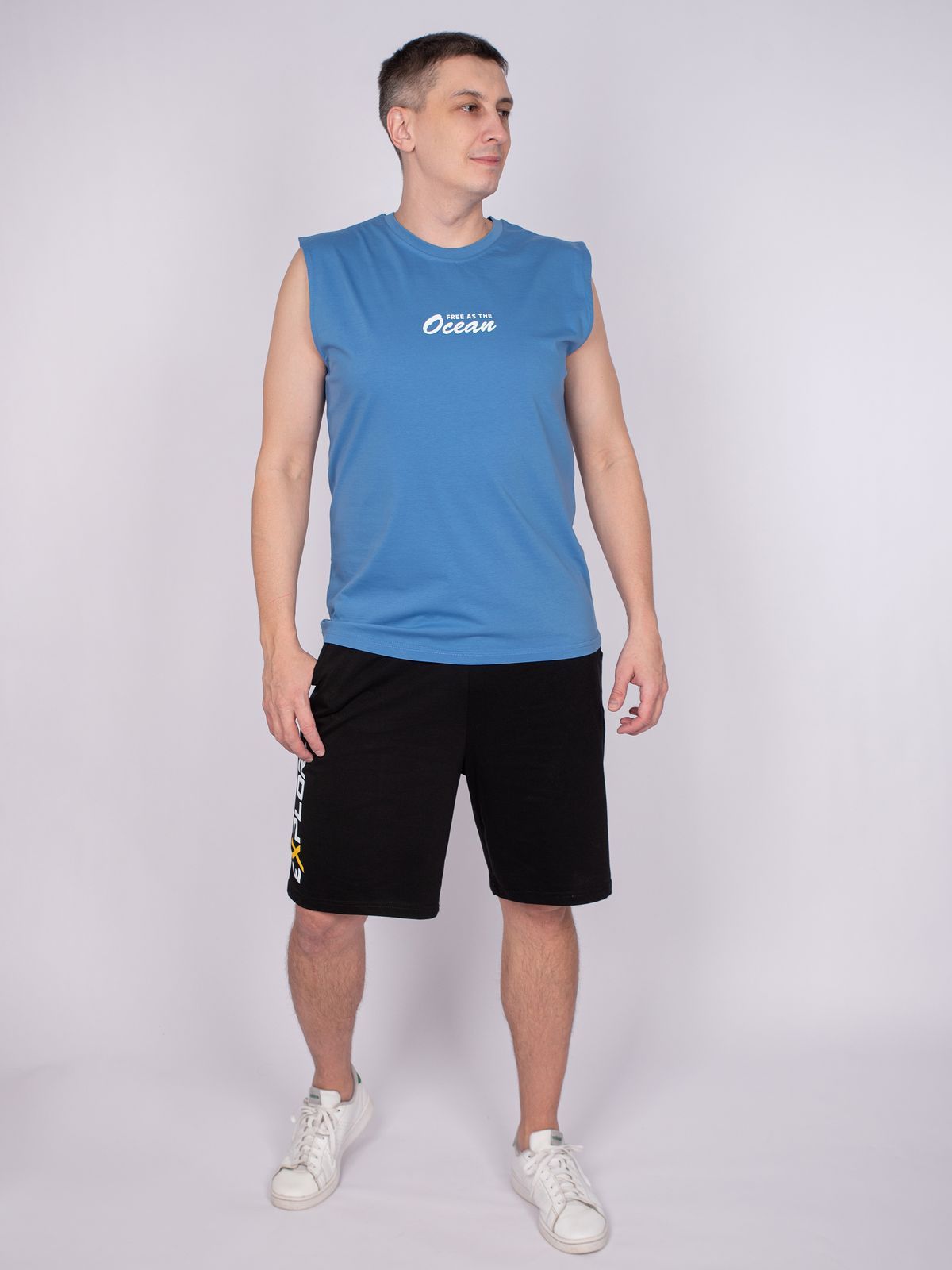 Майка мужская прямого силуэта. Горловина круглая, обработана воротником из рибаны. Горловина спинки внутри укреплена бейкой из кулирки. Низ изделия и рукавов обработан швом вподгибку. На полочке принт ШЕЛКОГРАФИЯ. Надпись переводится как "Свободен как океан". Модель рассчитана на рост 176-182.