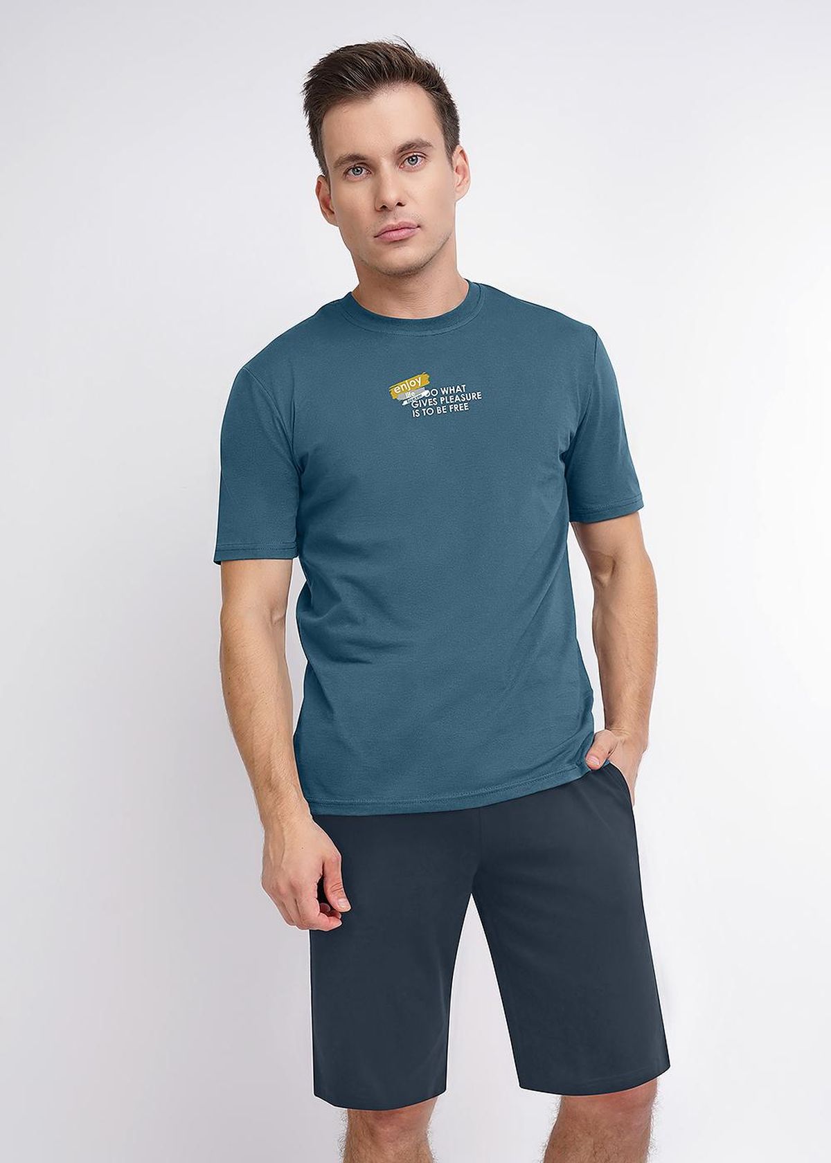 Футболка свободного покроя с круглым вырезом, на глади с авторским прином. Шорты комфортной посадки с поясом на внутренней резинке с карманами, кант сбоку по всей длине шорт в цвет футболки.