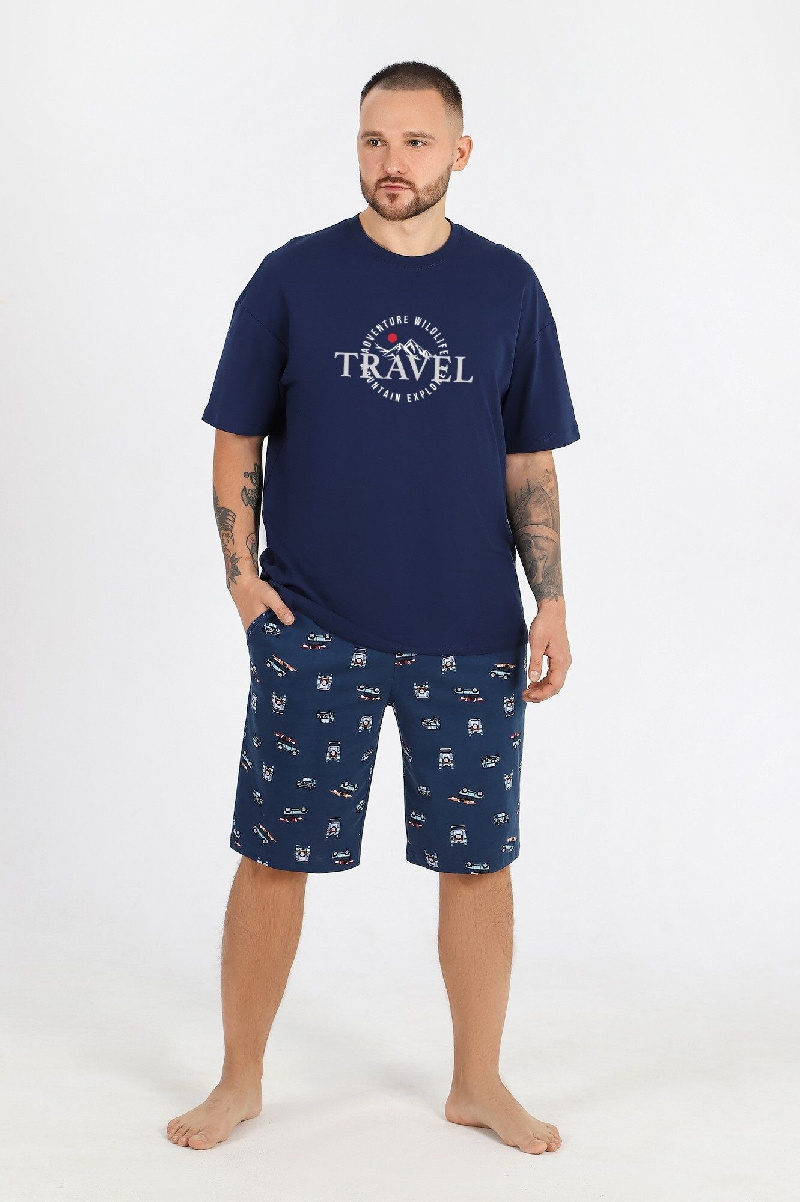 Костюм мужской ,состоящий из футболки и шорт. Футболка - из гладкокрашеного полотна "кулирка", классического покроя, с короткими втачными рукавами, горловиной овальной формы, обработанной втачной планкой, и принтом в центре переда, выполненным в технике шелкографии. Шорты - из полотна с набивным рисунком, удлиненные, на притачном поясе с эластичнойтесьмой внутри и карманами в боковых швах, входы в которые окантованы основным материалом.