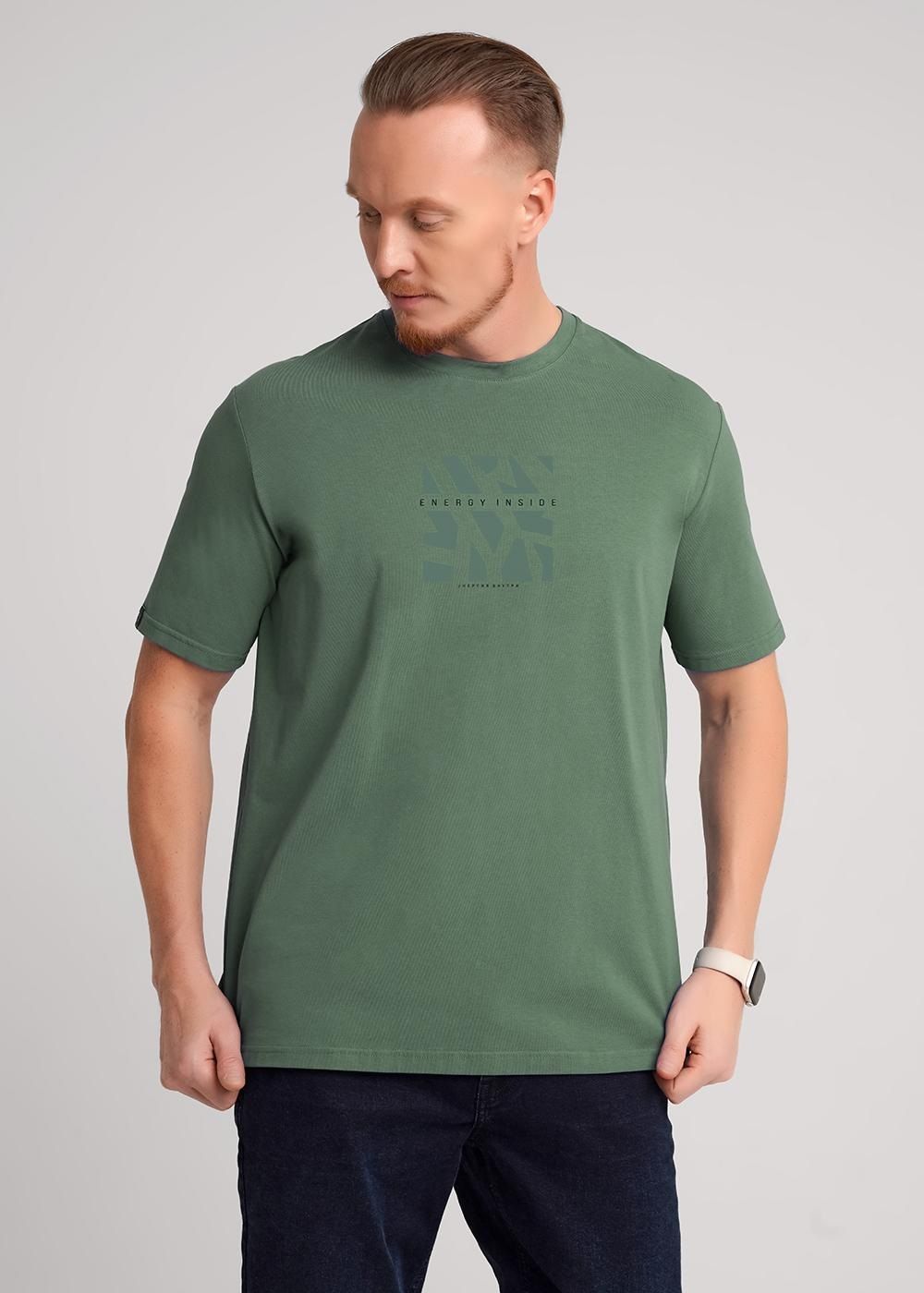 Фуфайка с коротким рукавом среднего объема в набивку «камуфляж», с круглым вырезом горловины, которая оформлена обтачкой из рибаны.
