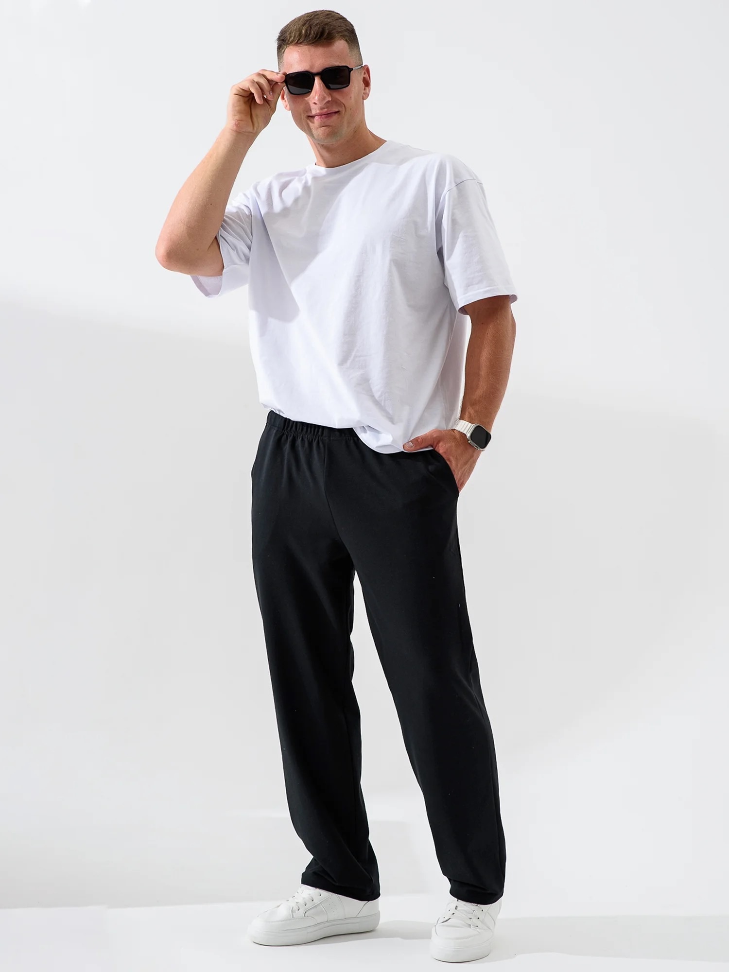 "Брюки мужские из трикотажного полотна ""футер-двунитка"" на притачном поясе с эластичной тесьмой внутри, декоративными вставками в боковых швах и карманами, обработанными в соединительных швах передних половин с декоративными вставками. Нижние срезы брюк обработаны с эластичной тесьмой. По швам втачивания вставок и входам в карманы настрочены отделочные строчки. Через петлю пояса продет шнурок, позволяющий регулировать степень прилегания изделия по талии.
