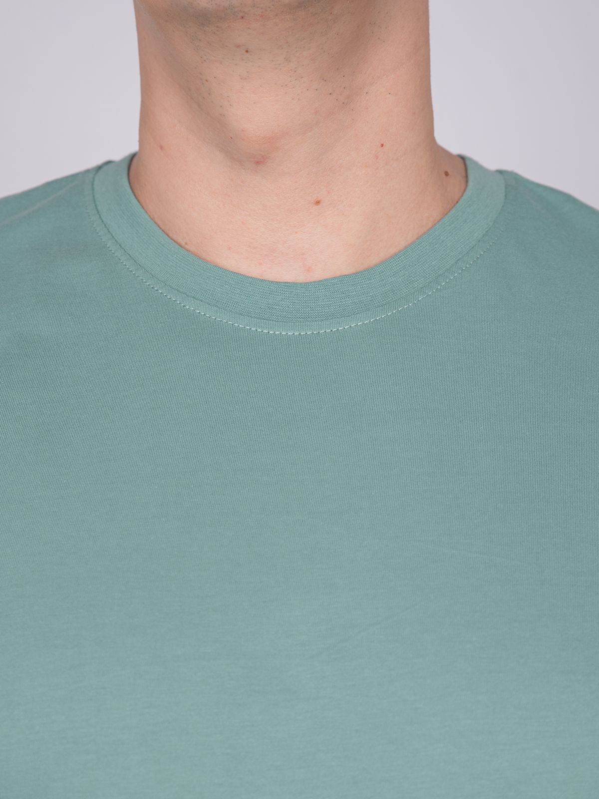 Футболка мужская из кулирки. Горловина обработана рибаной. Росток спинки обработан бейкой из кулирки. Рукав втачной, короткий. Модель рассчитана на рост 176-182.