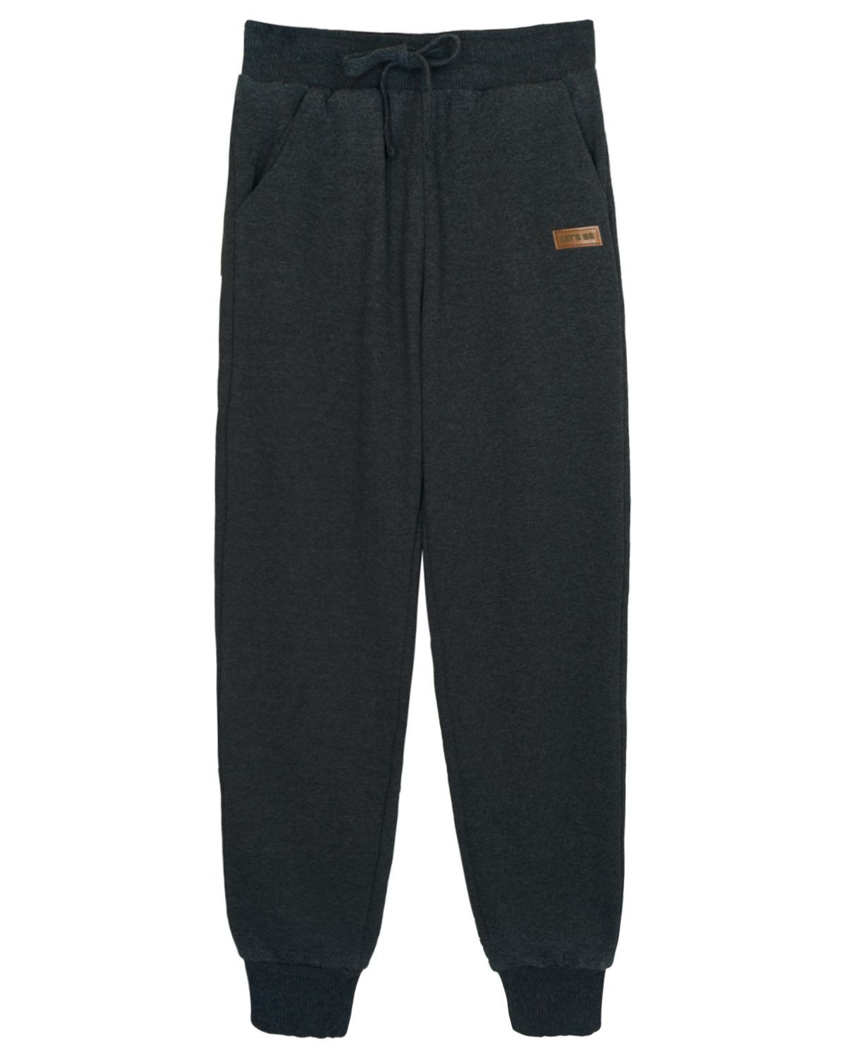 Брюки взрослые прямого силуэта. Пояс отрезной, выполнен из кашкорсе в цвет изделия, с эластичной тесьмой внутри. По поясу брюк вставлен плоский утягивающий шнурок черного цвета. На изделии выполнены карманы с отрезным бочком. По низу изделия манжеты из кашкорсе в цвет изделия. На левой половинке брюк нашивка. Модель рассчитана на рост 176-182 см.