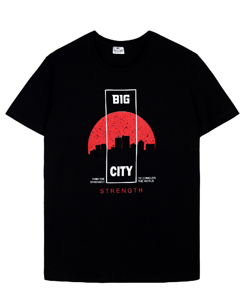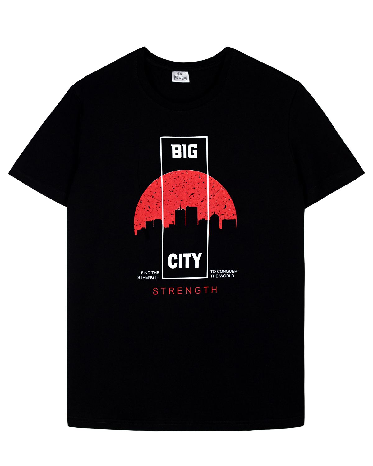 Футболка мужская прямого силуэта с втачным коротким рукавом. Горловина круглая, обработана воротником из рибаны. Горловина спинки внутри укреплена бейкой из кулирки. По горловине полочки отделочная строчка. Низ изделия и рукавов обработан швом в подгибку. На полочке принт шелкография. Надпись переводится как "Большой город; Найди в себе силы, чтобы покорить мир". Модель рассчитана на рост 176-182см.