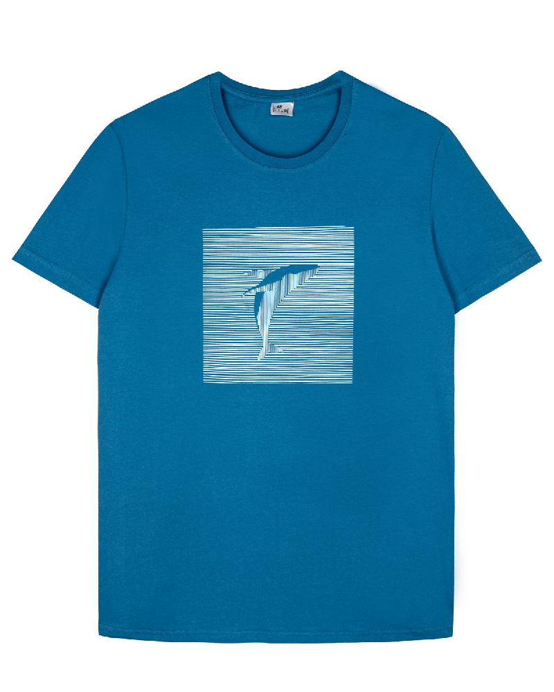 Футболка мужская прямого силуэта с втачным коротким рукавом. Горловина круглая, обработана воротником из рибаны. Горловина спинки внутри укреплена бейкой из кулирки. По горловине полочки отделочная строчка. Низ изделия и рукавов обработан швом в подгибку. На полочке принт шелкография. Модель рассчитана на рост 176-182см.
