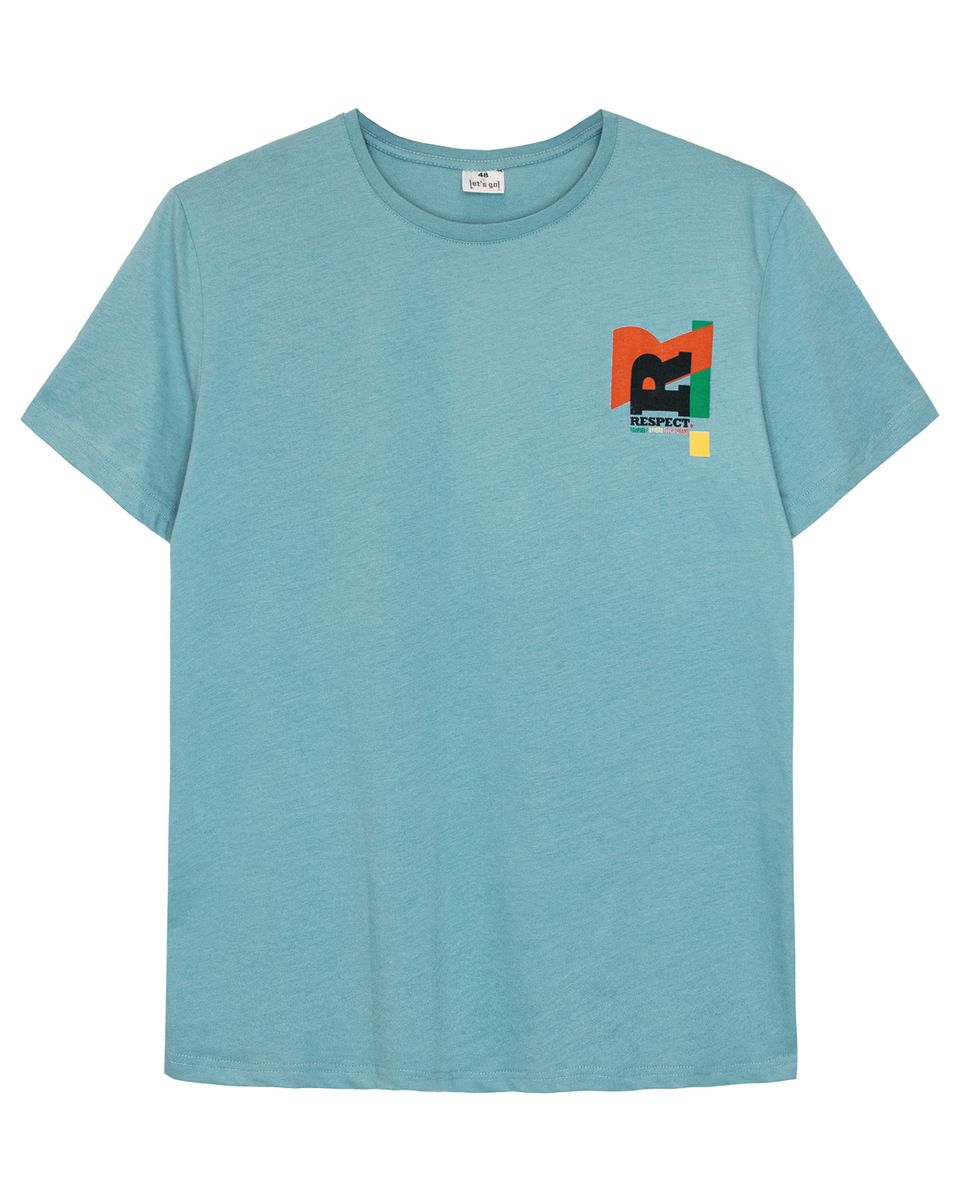 Футболка мужская прямого силуэта с втачным коротким рукавом. Горловина круглая, обработана воротником из рибаны. Горловина по полочке и спинке отстрочена нитками. Низ изделия и рукавов обработан швом в подгибку. На полочке принт шелкография. Надпись переводится как "Уважай; Себя других свои мечты". Модель рассчитана на рост 176-182см.
