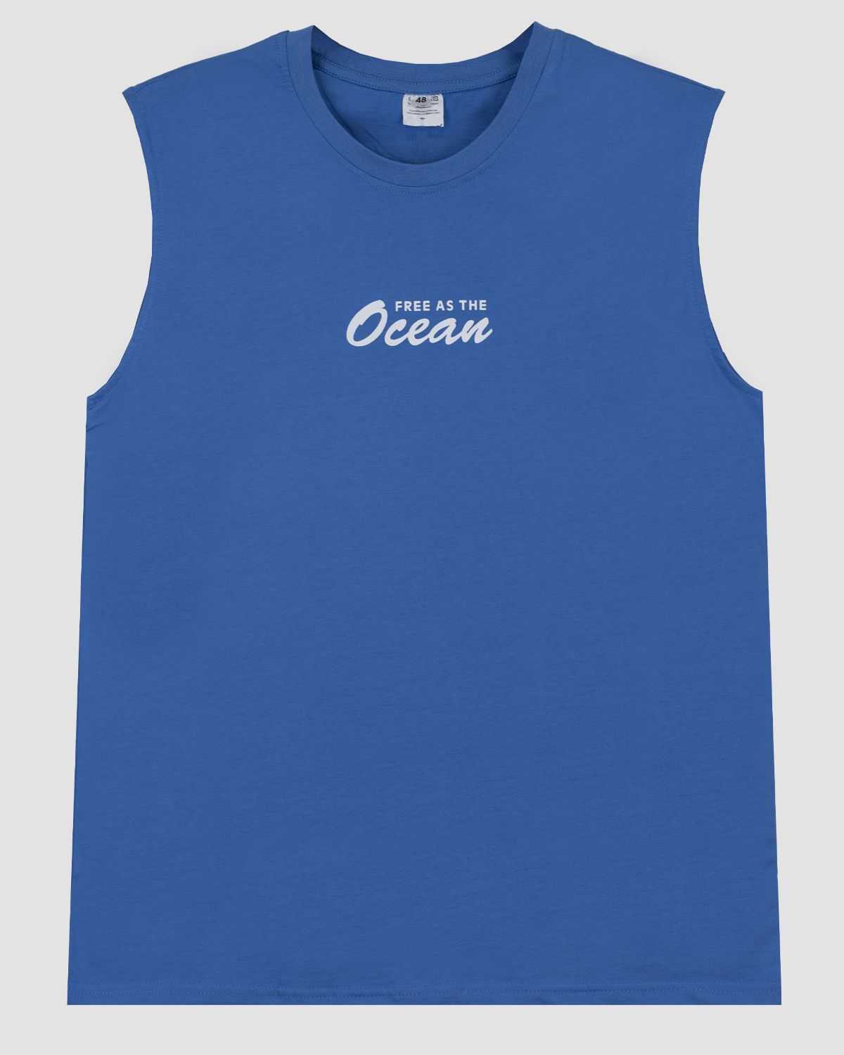 Майка мужская прямого силуэта. Горловина круглая, обработана воротником из рибаны. Горловина спинки внутри укреплена бейкой из кулирки. Низ изделия и рукавов обработан швом вподгибку. На полочке принт ШЕЛКОГРАФИЯ. Надпись переводится как "Свободен как океан". Модель рассчитана на рост 176-182.