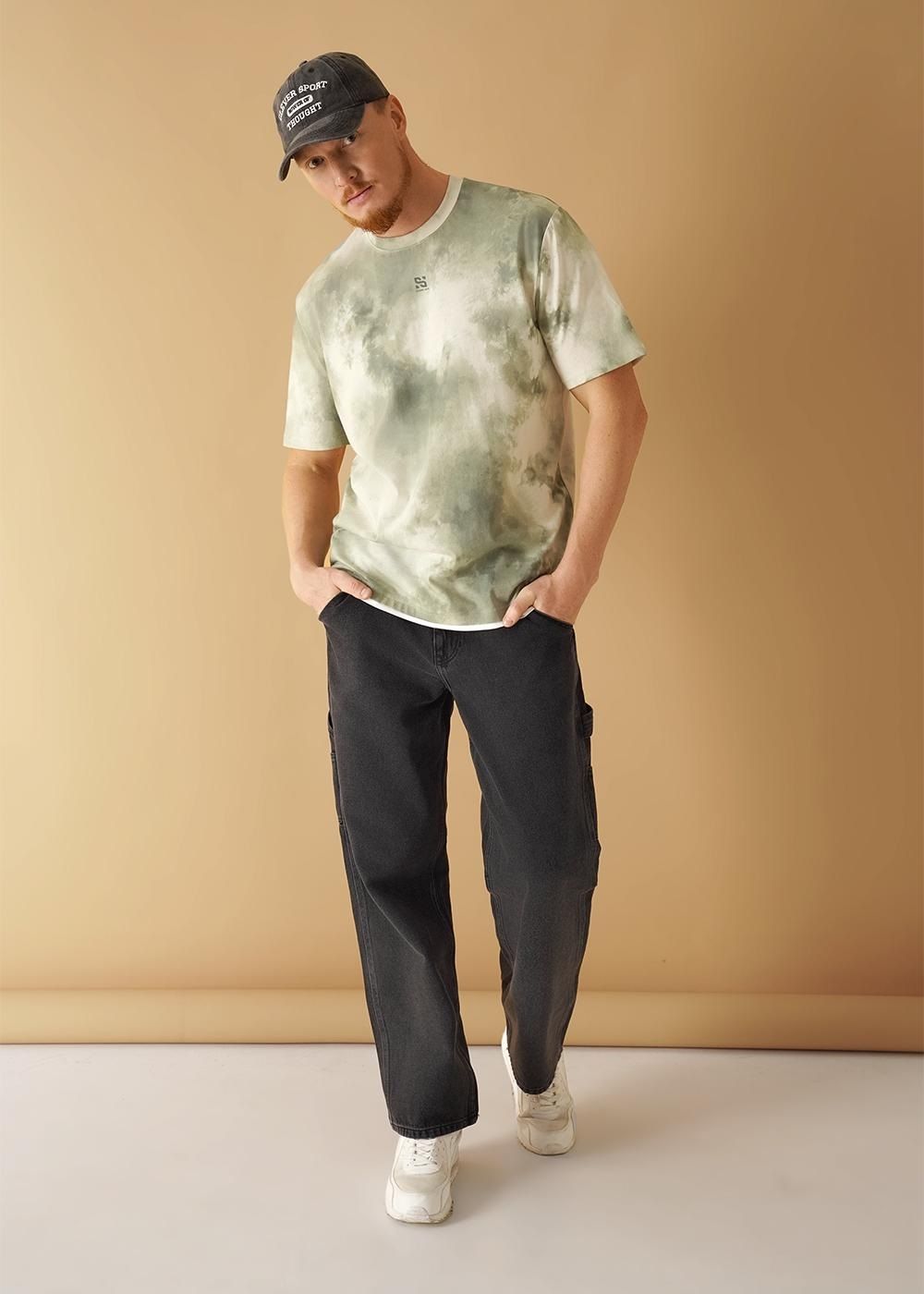 Стильная мужская футболка увеличенного объема. Выполнено из трикотажного полотна в хаотичную набивку. Изделие с круглым вырезом горловины и коротким рукавом. Модель дополняет принт и имиджевая фурнитура. Хорошо сочетается с джинсами.