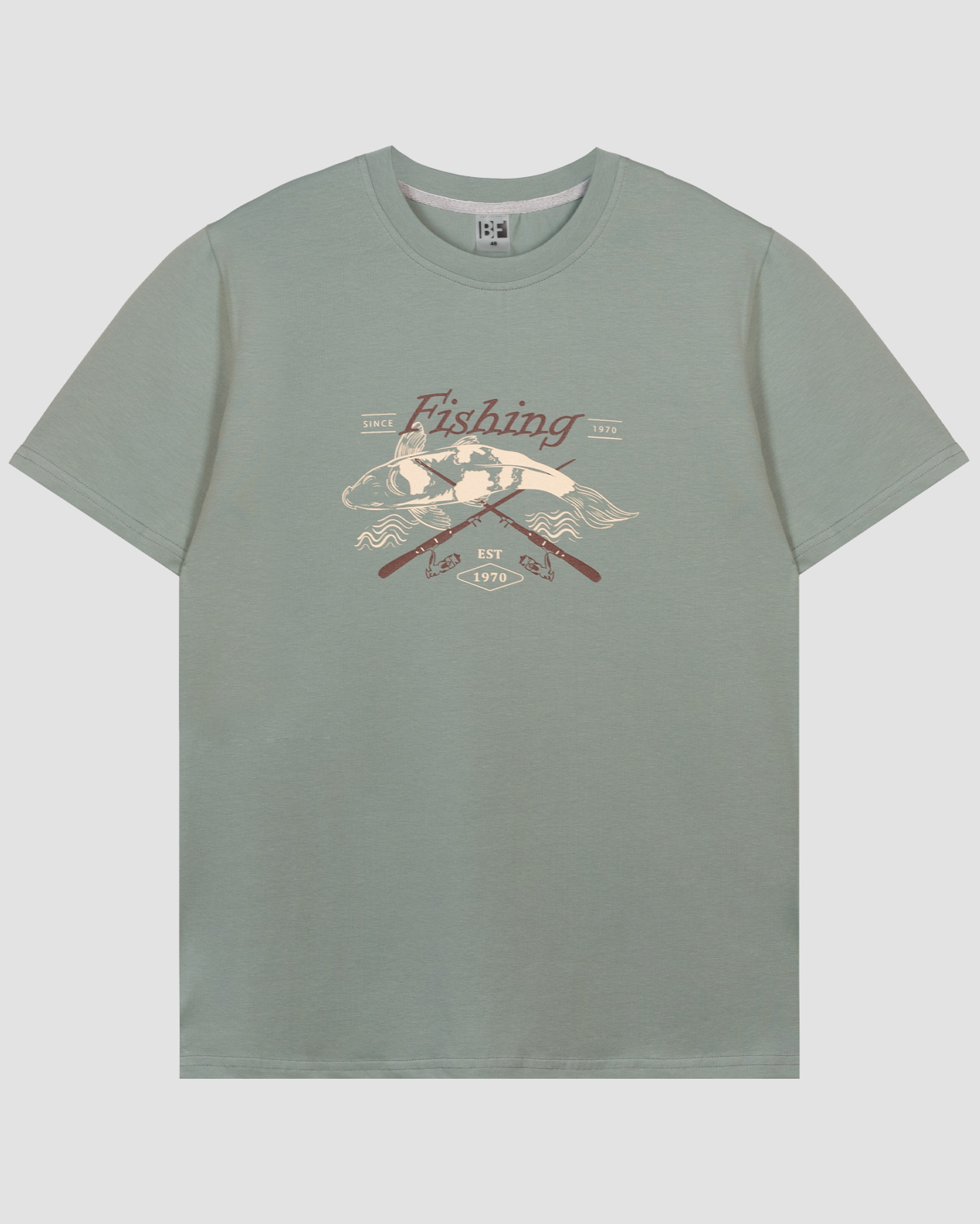 Футболка мужская прямого силуэта с втачным коротким рукавом. Горловина V-образная, обработана воротником из рибаны. Горловина спинки внутри укреплена бейкой из кулирки. По горловине полочки отделочная строчка. Низ изделия и рукавов обработан швом в подгибку. На полочке фотопринт. Надпись переводится как "Все возвращается к реке". Модель рассчитана на рост 176-182см.