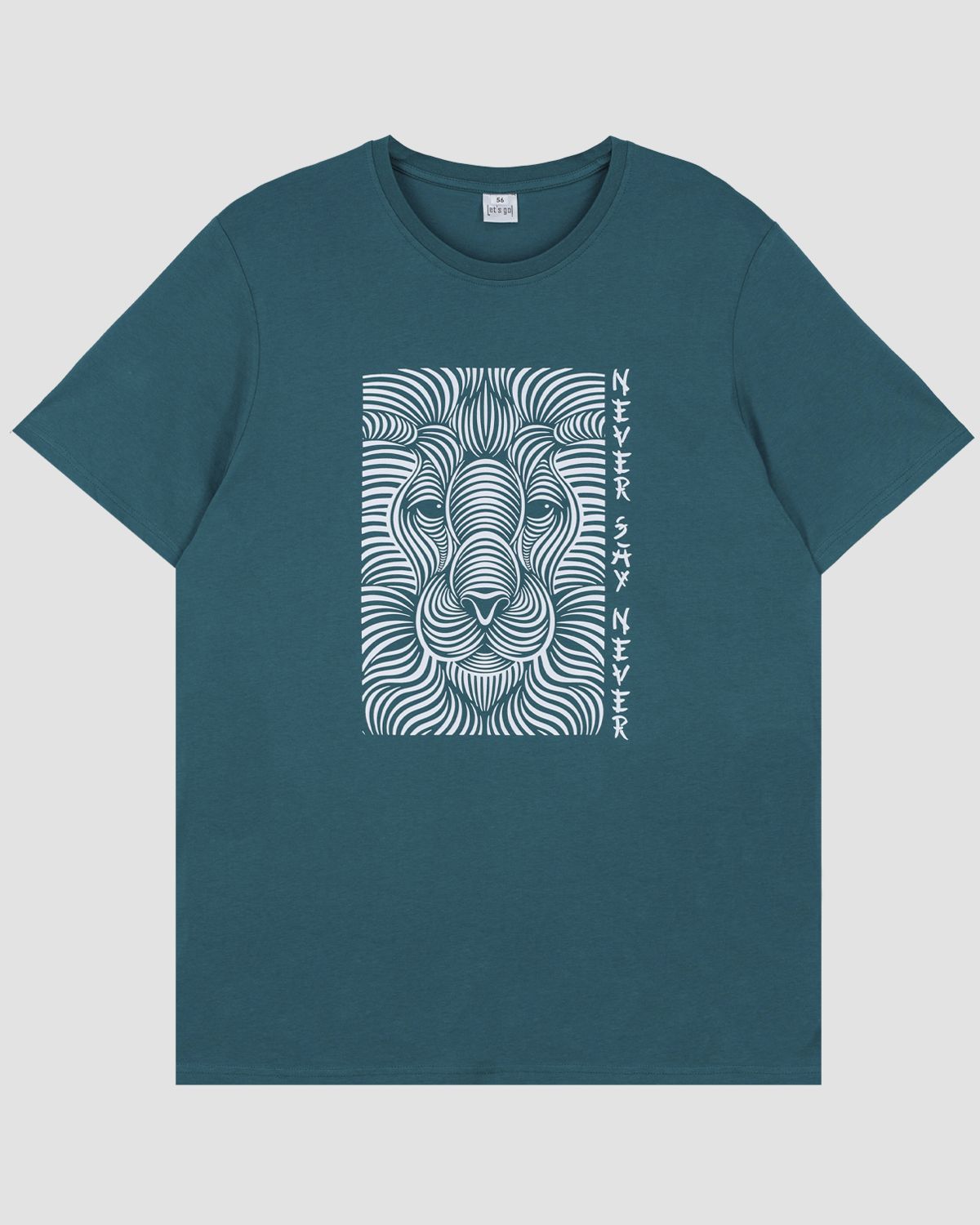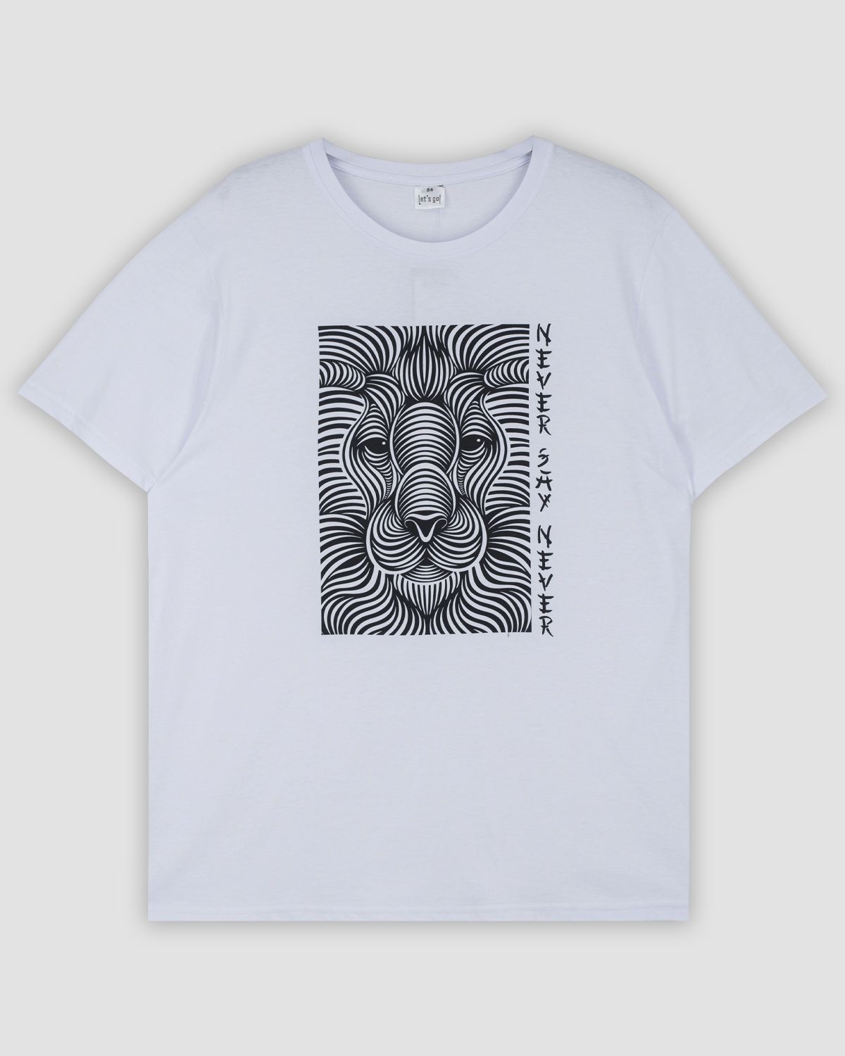 Футболка мужская прямого силуэта с втачным коротким рукавом. Горловина круглая, обработана воротником из рибаны. Горловина спинки внутри укреплена бейкой из кулирки. Низ изделия и рукавов обработан швом в подгибку. На полочке принт ШЕЛКОГРАФИЯ. Надпись переводится как "Никогда не говори никогда". Модель рассчитана на рост 176-182см.