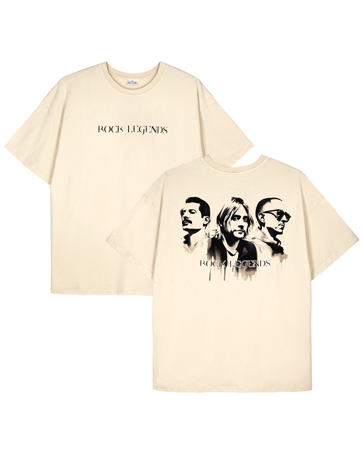 Футболка мужская оверсайз с втачным удлиненным рукавом. Горловина круглая, обработана воротником из рибаны. Горловина спинки внутри обработана настрочной планкой из кулирки. Низ изделия и рукавов обработан швом вподгибку. На полочке принт шелкография, на спинке фотопринт. Надпись переводится как "Легенды рока". Модель рассчитана на рост 176-182см.