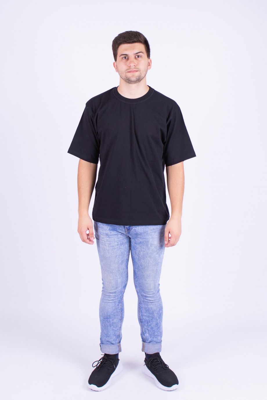 Футболка мужская из кулирки. Горловина обработана рибаной. Росток спинки обработан бейкой из кулирки. Рукав втачной, короткий. Модель рассчитана на рост 176-182.