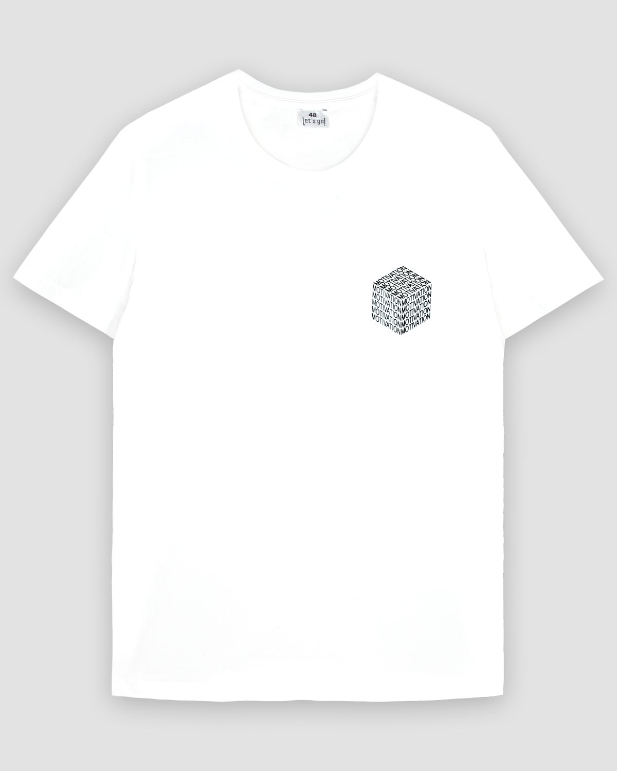 Футболка мужская прямого силуэта с втачным коротким рукавом. Горловина круглая, обработана воротником из рибаны. Горловина спинки внутри укреплена бейкой из кулирки. По горловине полочки отделочная строчка. Низ изделия и рукавов обработан швом в подгибку. На полочке принт шелкография. Модель рассчитана на рост 176-182см.