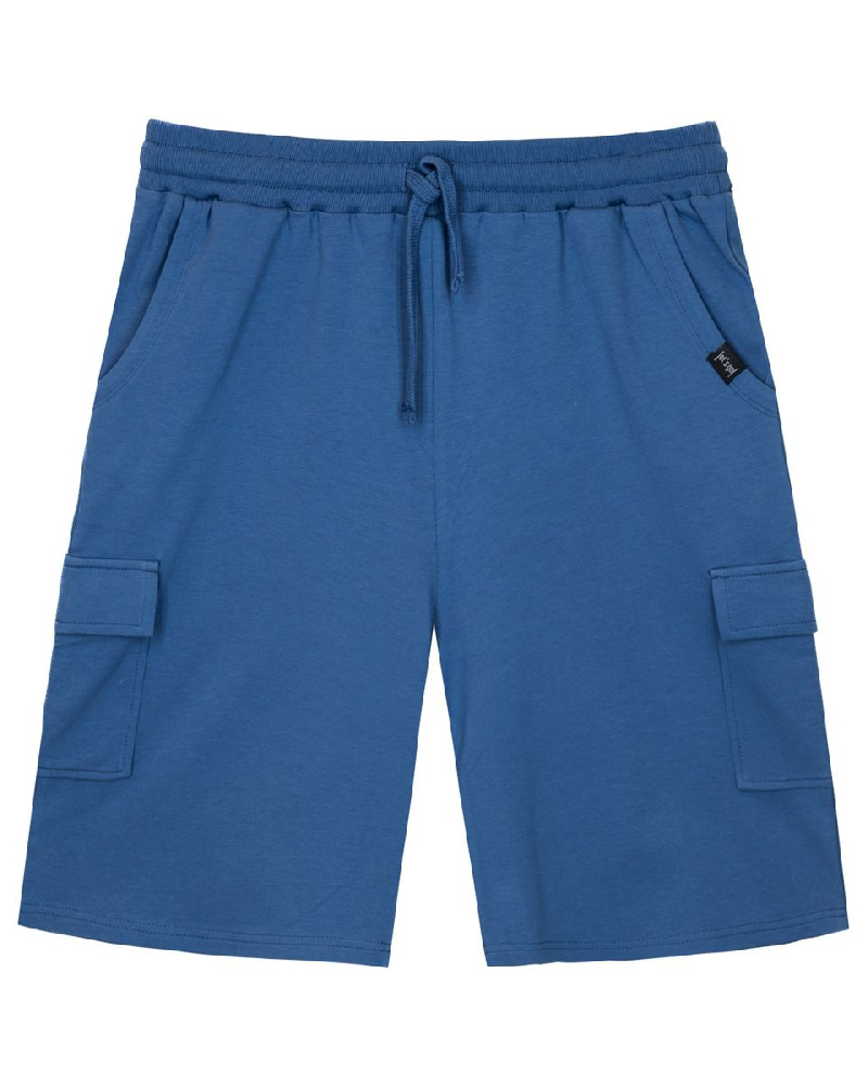 Шорты мужские, прямого силуэта с накладными карманами. Отрезной пояс, в цвет изделия, из кашкорсе с эластичной тесьмой внутри, закрепленной в шов. По поясу шорт вставлен плоский утягивающий шнурок. Длина шнурка = длина пояса + 45 см для возможности завязывания. На передней половинке шорт карманы с отрезным бочком. На боковом срезе шорт располагается накладной карман с клапаном из основного полотна. Карман располагается с 2-х сторон симметрично. Низ изделия обработан швом в подгибку. На левом кармане вшивной элемент, закрепленный отстрочкой. Модель рассчитана на рост 176-182см.