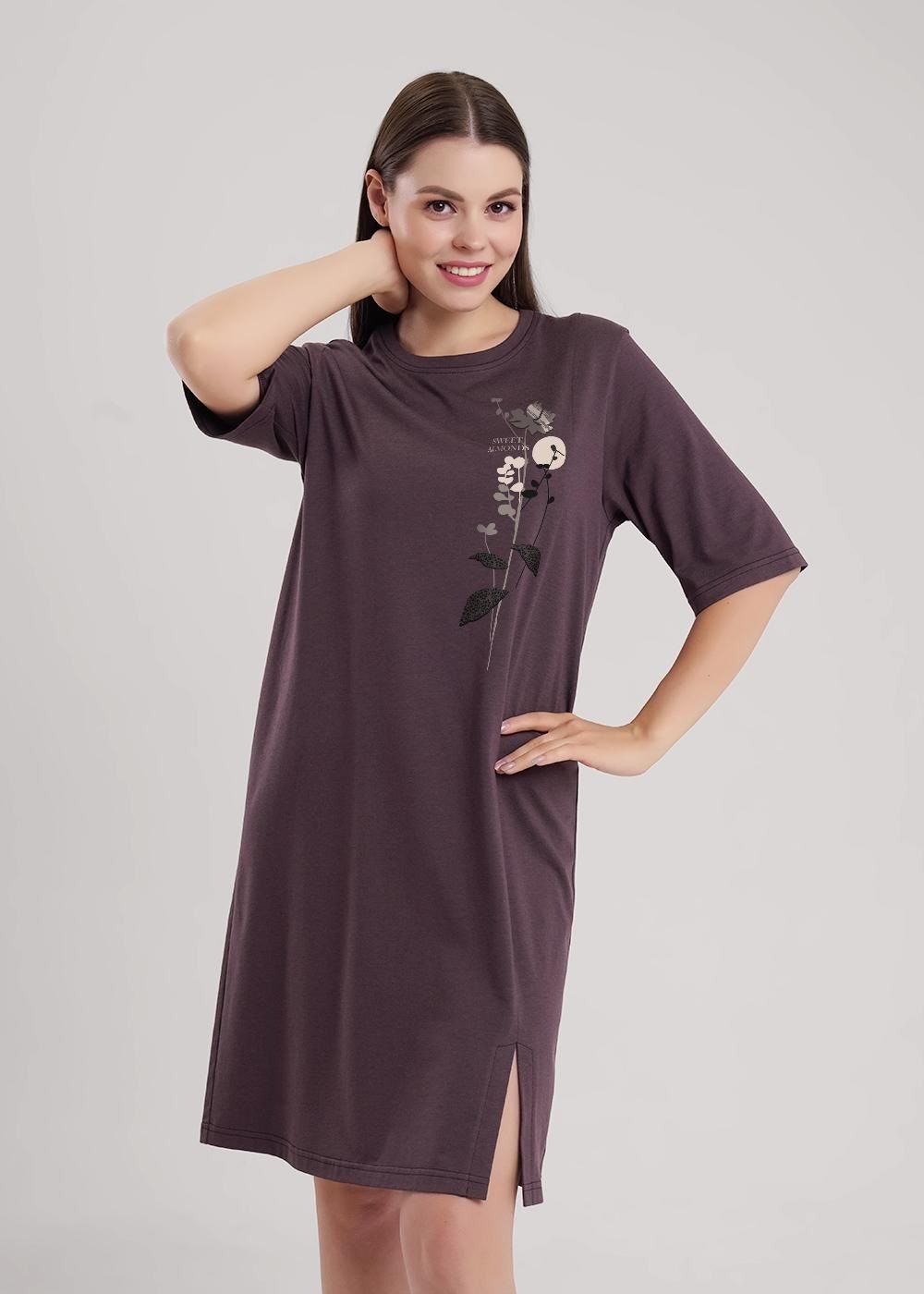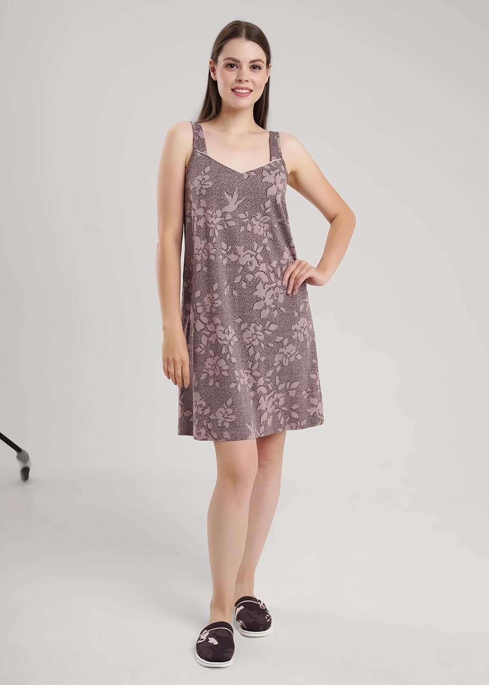 Платье для дома и отдыха из трикотажного полотна с добавлением модала, прямого силуэта. Округлая горловина с обтачкой. Втачной короткий рукав. По переду вертикальный рез, внизу с разрезом. Спереди и по рукаву принт.