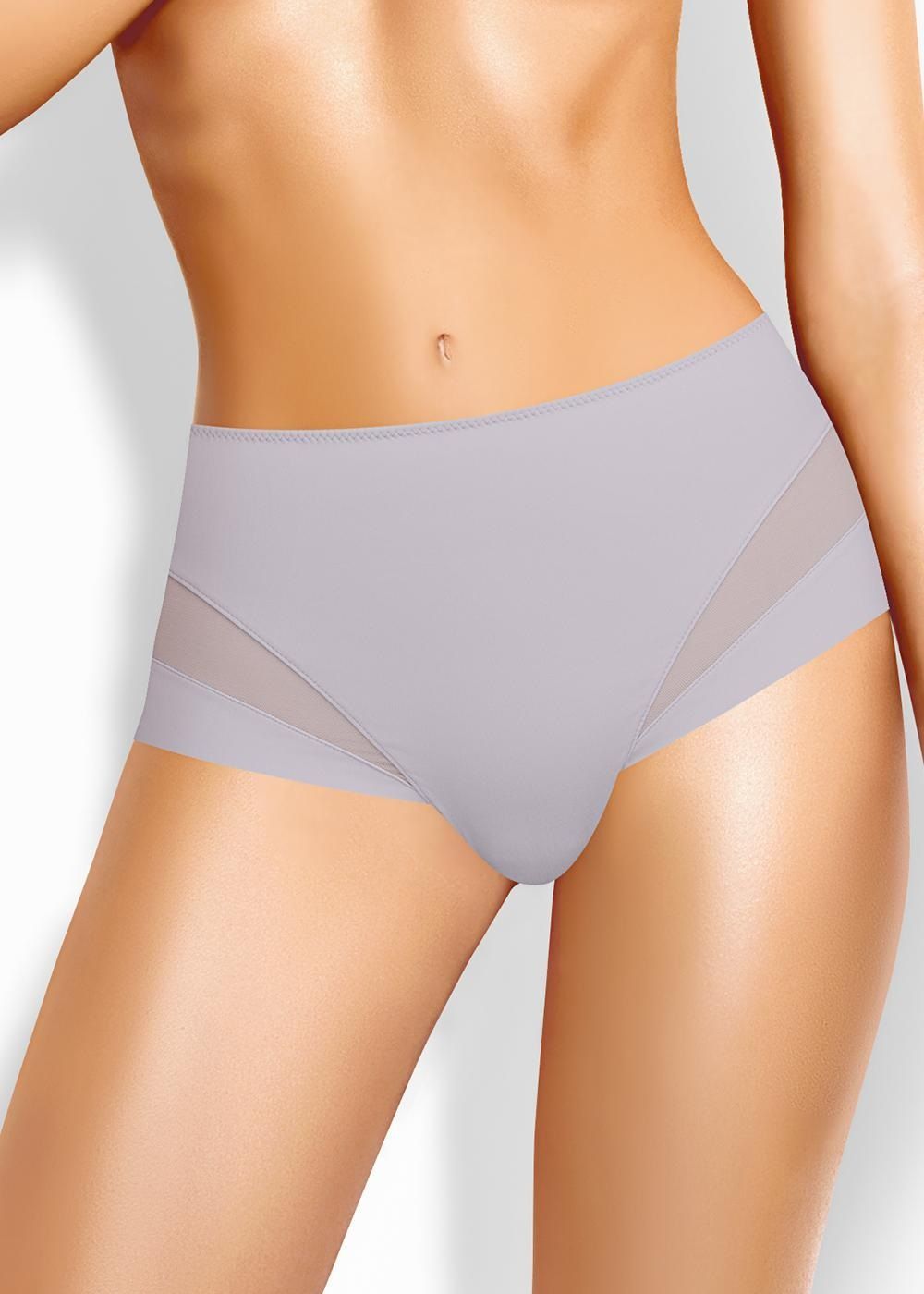 Трусы слипы с завышенной посадкой, сзади и по линии бикини бесшовная гладкая обработка, спереди декоративные диагональные вставки из плотной сетки, перед дублирован сеткой, по талии обработка с зигзагом и узкой резинкой