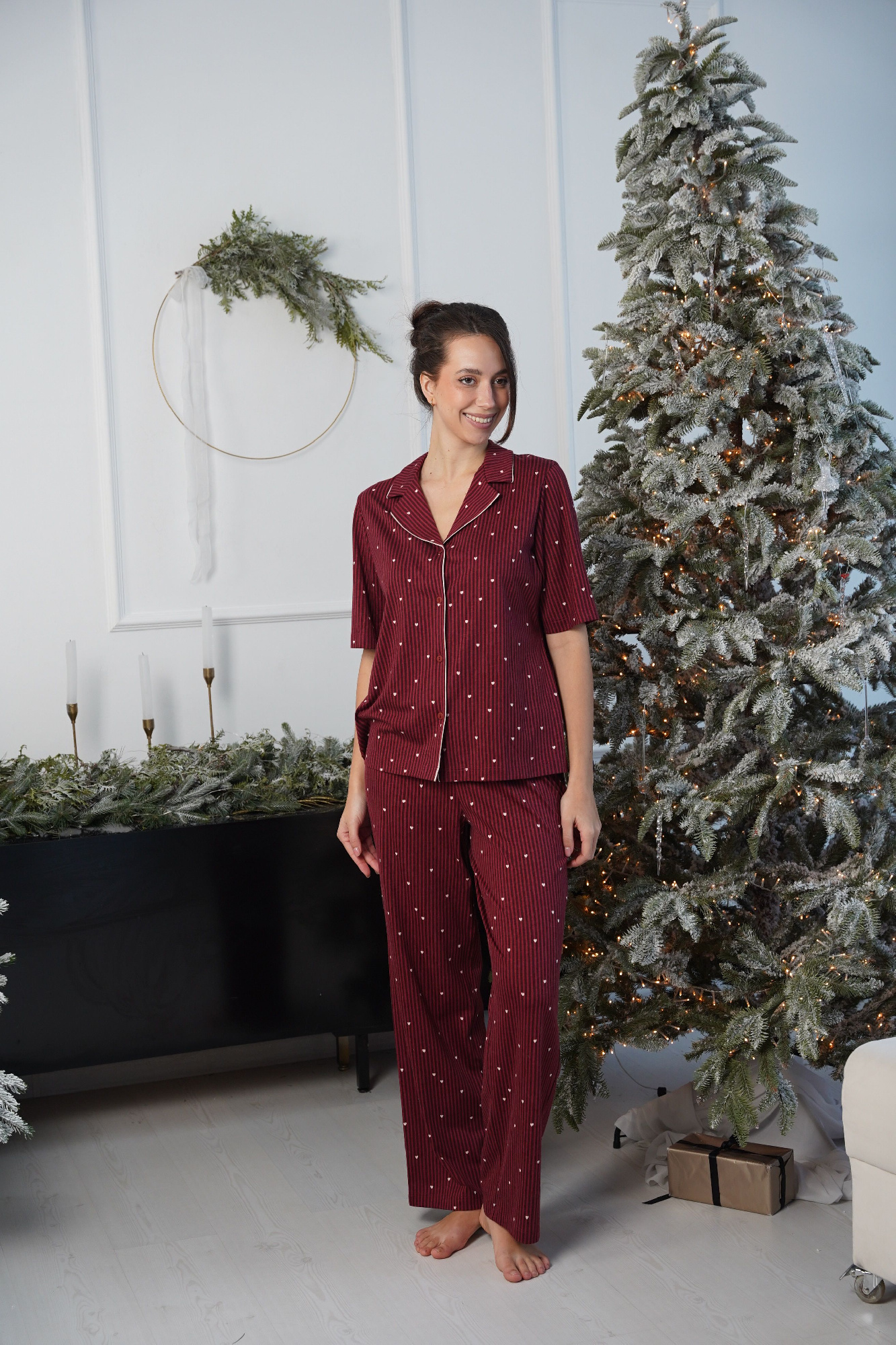Сорочка женская из трикотажного полотна «кашкорсе» с набивным рисунком, слегка расширенная книзу, с короткими втачными рукавами, углубленной формой горловины. Низ изделия и нижние срезы рукавов обработаны эластичной тесьмой с фасонным краем.