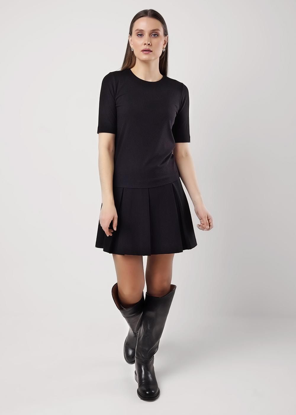 Юбка из трикотажного полотна джинс, длиной мини. По переду и спинке бантовые складки. По талии притачной пояс, спереди нашивка. Потайная молния в боковом шве.