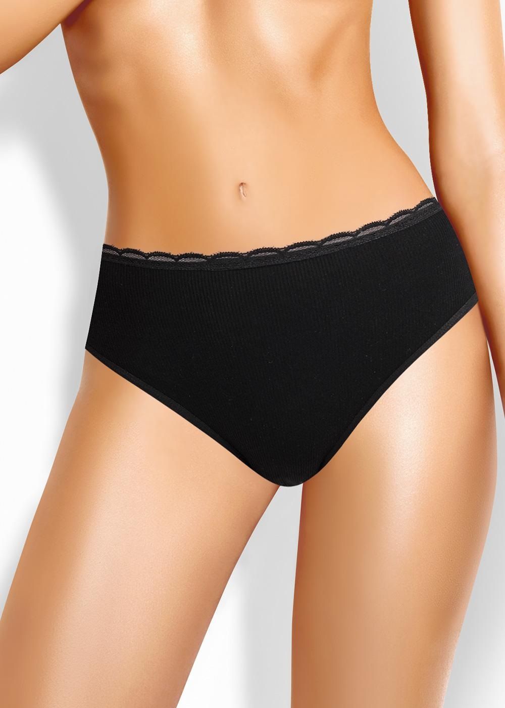 Трусы бикини женские из эластичного вискозного полотна- кашкорсе лапша. Обработка краев по талии - жаккардовая резинка, по ноге - узкое кружево.