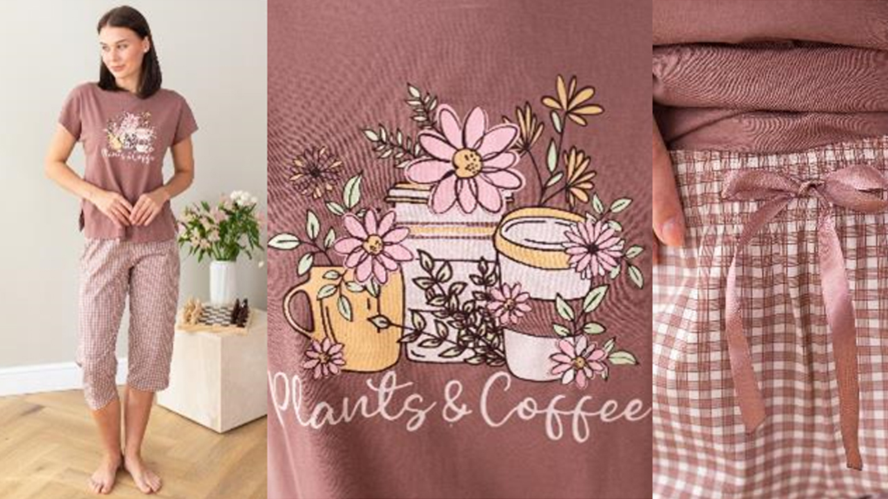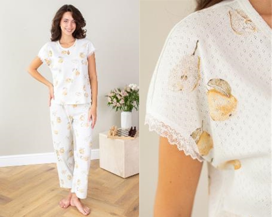 Сорочка женская из трикотажного полотна «кулирка» с набивным рисунком, свободного покроя, слегка расширенная книзу, с короткими втачными рукавами и горловиной овальной формы. Полочка – с отделочной деталью, повторяющей контур горловины, в шве притачивания которой симметрично относительно центра заложены 6 складочек-защипов. Наружный край горловины и низ рукавов обработаны узким кружевом.