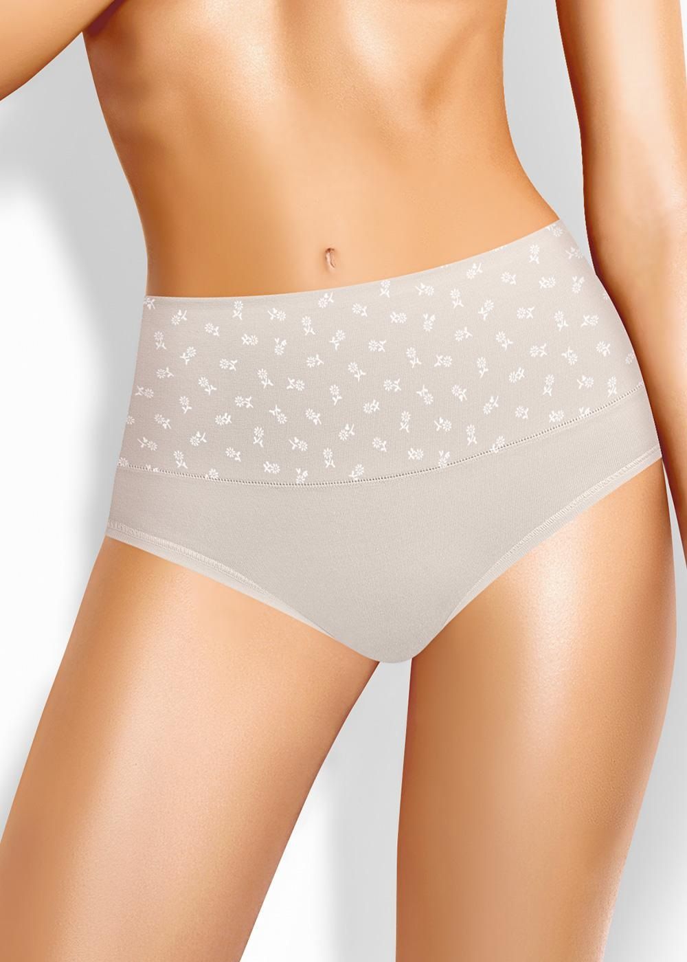 Трусы макси женские из эластичного хлопкового полотна. Обработка краев по талии жаккардовая резинка, по ноге - полуокантовка. По переду боковые вставки из сетки, швы застилом.