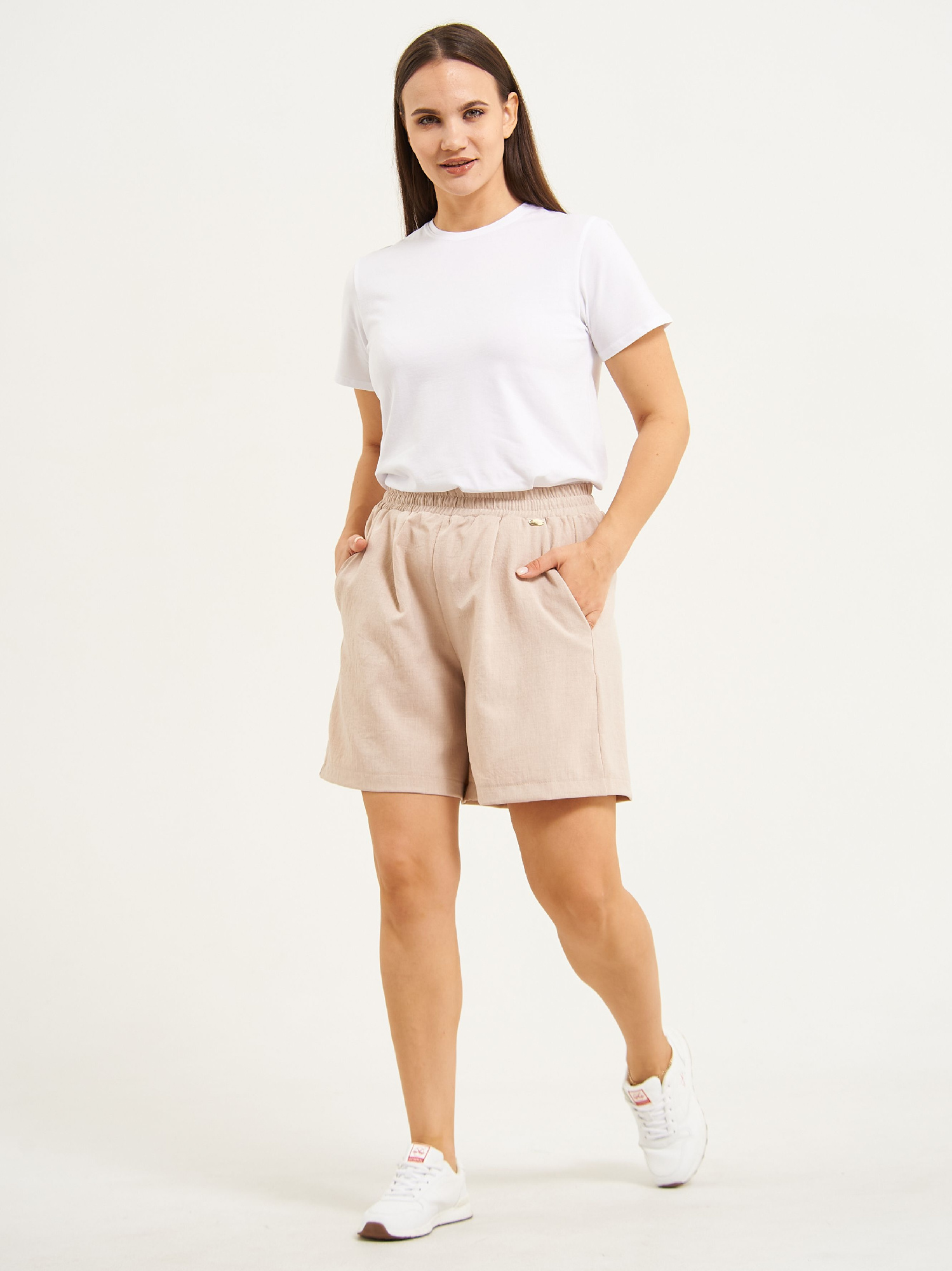 Шорты женские из гладкокрашеного тканого штапельного полотна, свободные, с карманами в боковых швах, на притачном поясе с эластичной тесьмой внутри. Средний шов передних половин обработан имитацией «гульфика»,