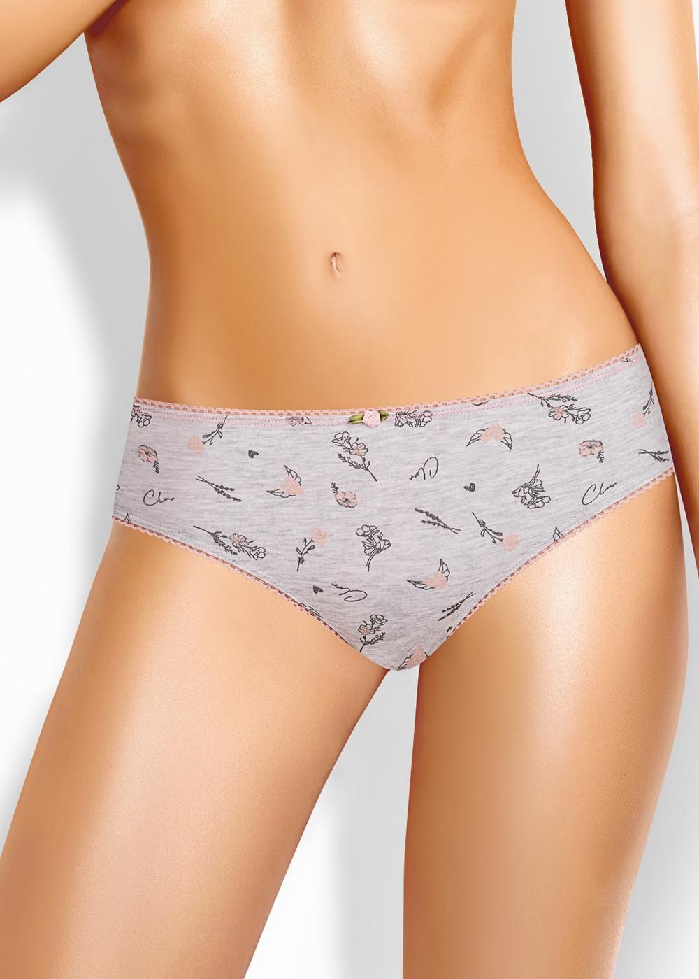 Трусы бикини женские из эластичного хлопкового полотна. Обработка краев по талии - окантовочная резинка с застилом, по ноге - полуокантовка. Спереди принт.