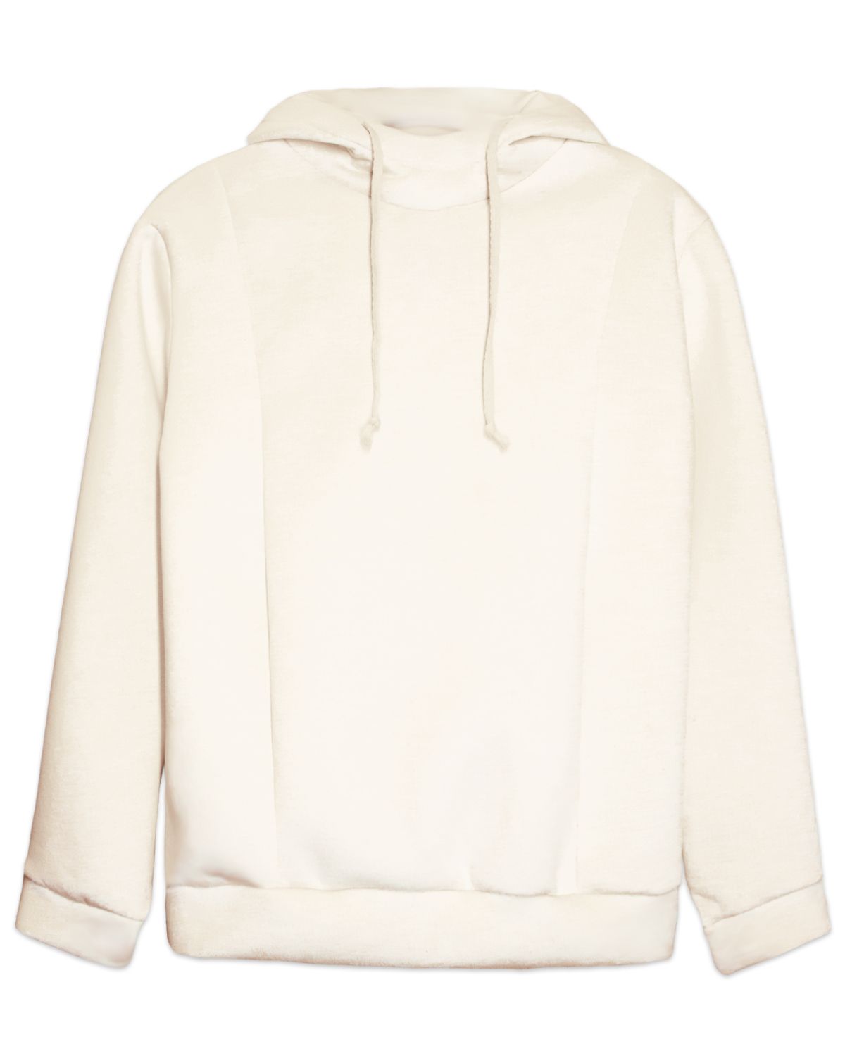 Комплет женский. Брюки женские прямого силуэта. Пояс отрезной, выполнен из основного полотна, с эластичной тесьмой внутри, шириной 5 см, тесьма закреплена в шов. По поясу брюк вставлен плоский утягивающий шнурок в цвет брюк, низ шнурка подвернут и застрочен, шнурок закреплен отстрочкой вдоль пояса. На изделии выполнены карманы с отрезным бочком и отлетной мешковиной, вход в карман обтачной. По низу изделия манжеты из основного полотна с эластичной тесьмой внутри в цвет изделия. Модель рассчитана на рост 164-170. Толстовка взрослая прямого силуэта с спущенным длинным рукавом. Горловина круглая с капюшоном. Капюшон состоит из 2 половин. Горловина спинки внутри обработана настрочной планкой из киперной ленты. С изнанки капюшона выполнен подклад из кулирки. По переднему срезу капюшона для утяжки вставлен утягивающий круглый канатный шнурок в цвет изделия, по низу шнурка узелок. Для выхода шнурка предусмотрены пробивные петли. Рукав заканчивается манжетой из основного полотна. По низу изделия пояс из основного пол