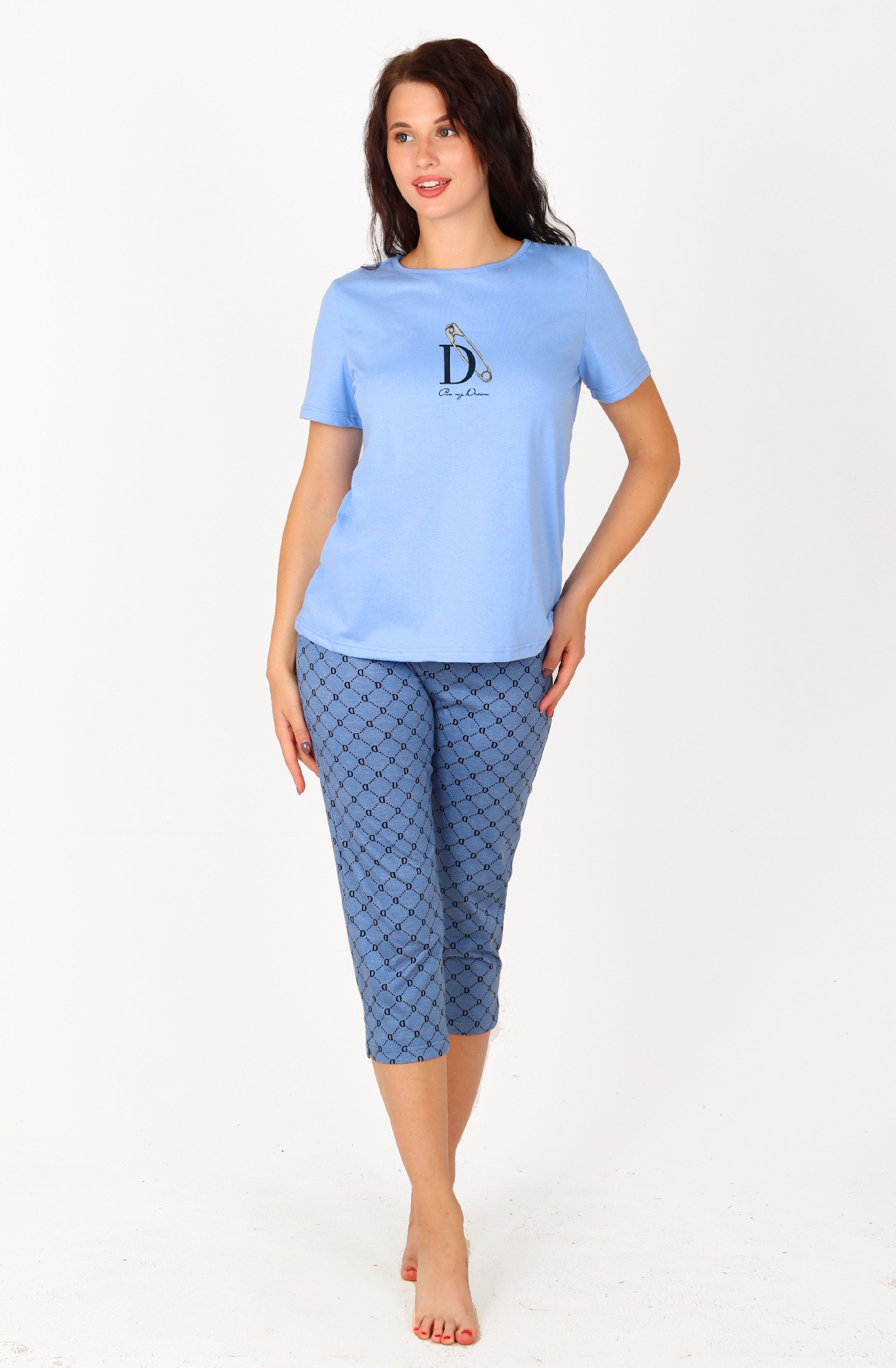 Пижама молодежная из трикотажного полотна «кашкорсе» с набивным рисунком, состоящая из футболки и шорт. Футболка - классического покроя с углубленной формой горловины, окантованной основным материалом и украшенной декоративной строчкой «кроше». Нижние срезы рукавов обработаны узкой обметочной строчкой, создающей красивый волнистый край.