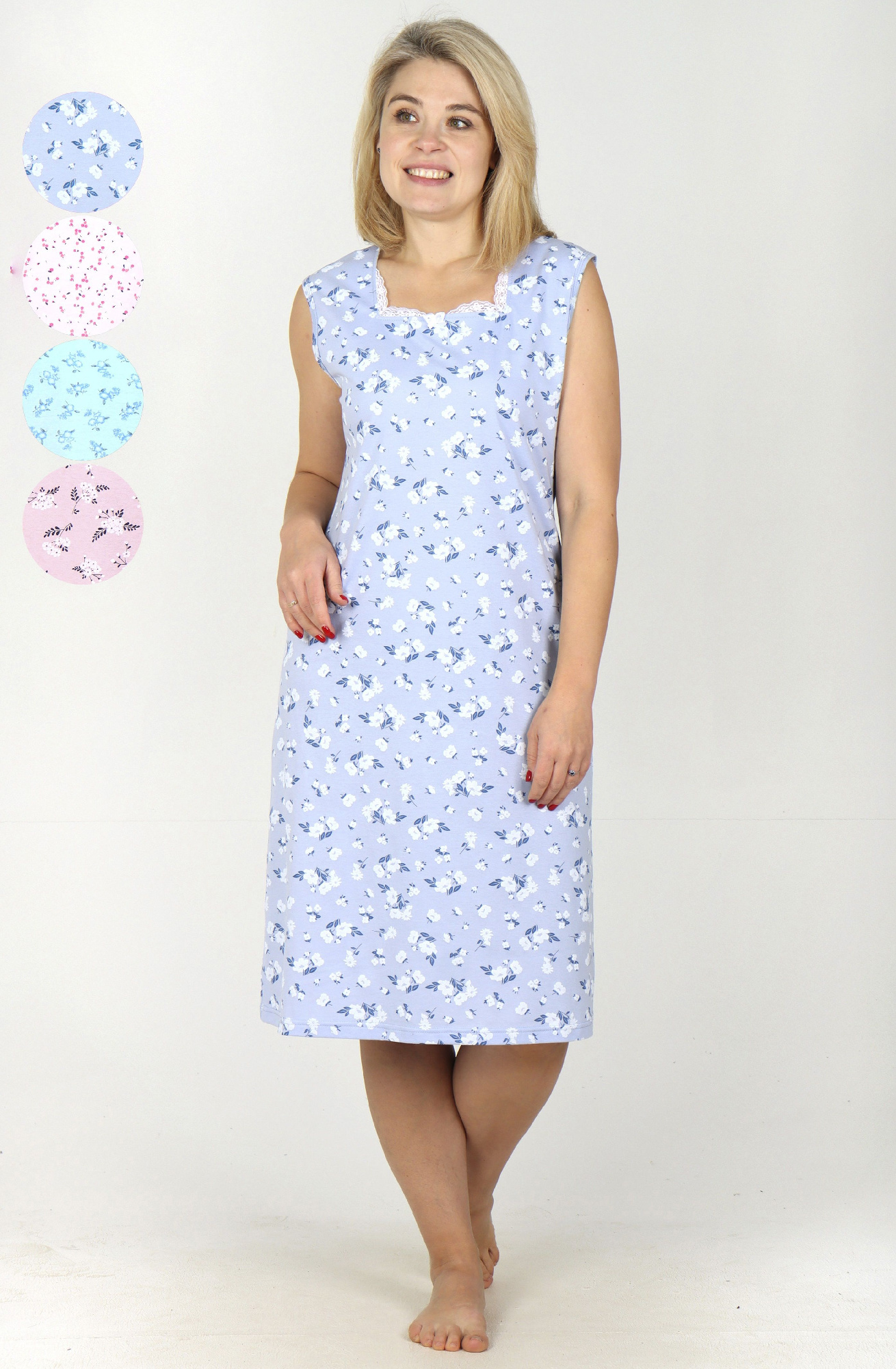 Сорочка женская из трикотажного полотна «кулирка» с набивным рисунком, расширенная книзу, без рукавов, с расширенной, углубленной горловиной овальной формы и притачной кокеткой по переду. Срезы пройм и горловины, а также шов притачивания кокетки, обработаны фасонной эластичной тесьмой с кружевным краем. Низ изделия обработан узкой обметочной строчкой.
