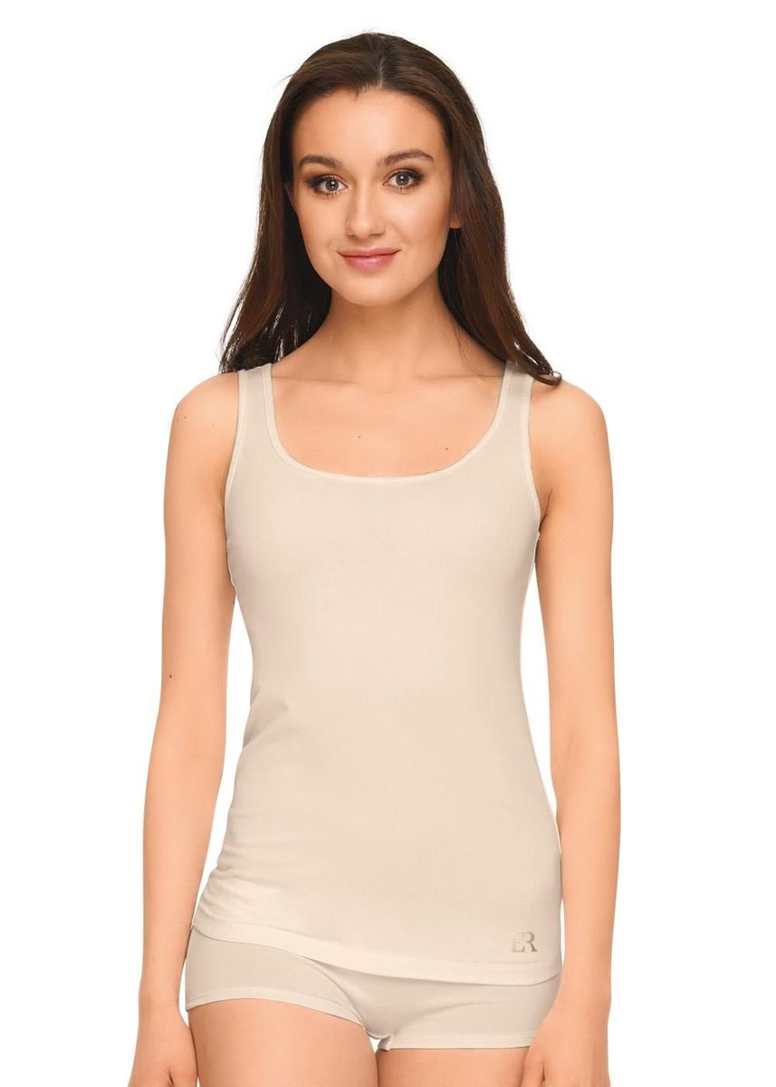 Майка женская из эластичного полотна с хлопком и модалом в составе. Узкая бретель. Круглый вырез горловины. Фирменный силиконовый логотип.