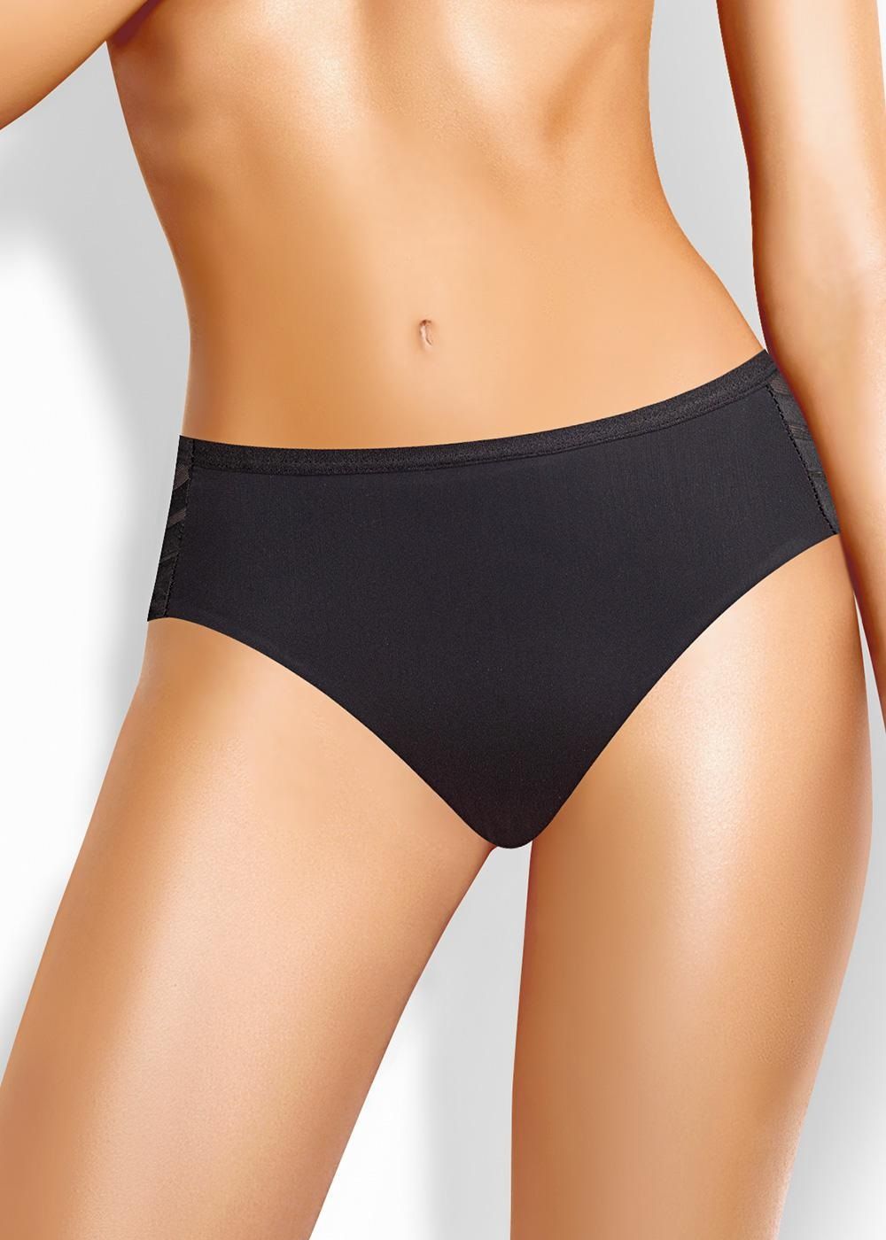 Трусы бикини женские из полиамида с эластаном. По переду вставки из сетки. Обработка краев - подклееный край. Хлопковая ластовица.
