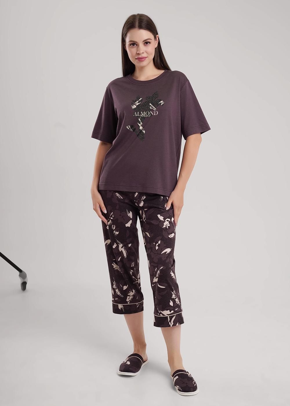 Набор одежды из трикотажного полотна с добавлением модала. Футболка прямого кроя, втачной короткий рукав. Округлая горловина с обтачкой. Спереди принт. Бриджы с поясом на резинке, нашивка, по низу манжет с кантом. Боковые карманы с отрезным бочком.