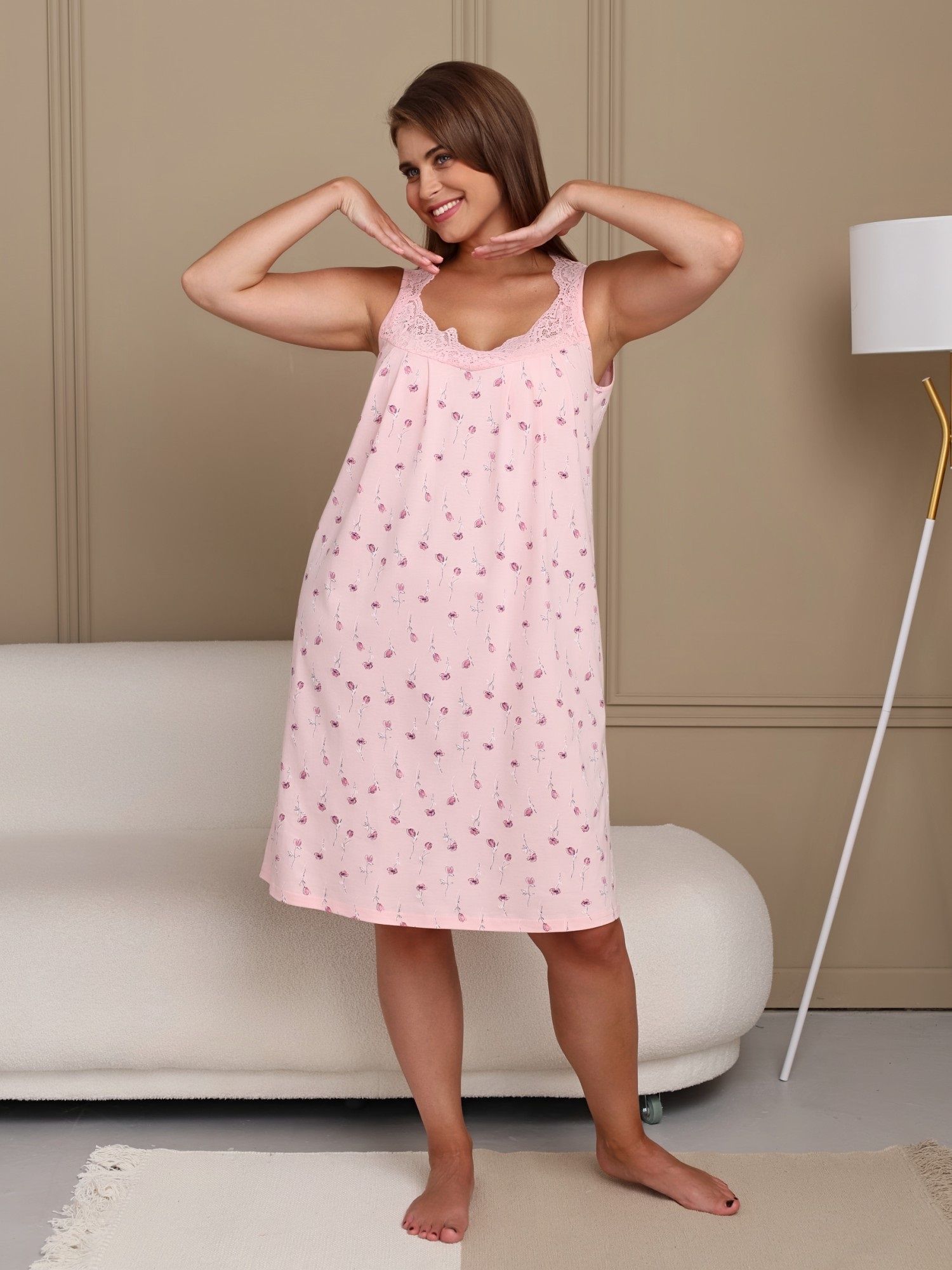 Ночная сорочка из гладкокрашеного вискозного трикотажного полотна, свободного покроя, слегка расширенная книзу, без рукавов. На полочке притачные кокетки, выполненные из кружева и образующие v-образный вырез горловины. Проймы, кружевные бретели и верхний срез спинки окантованы основным материалом.