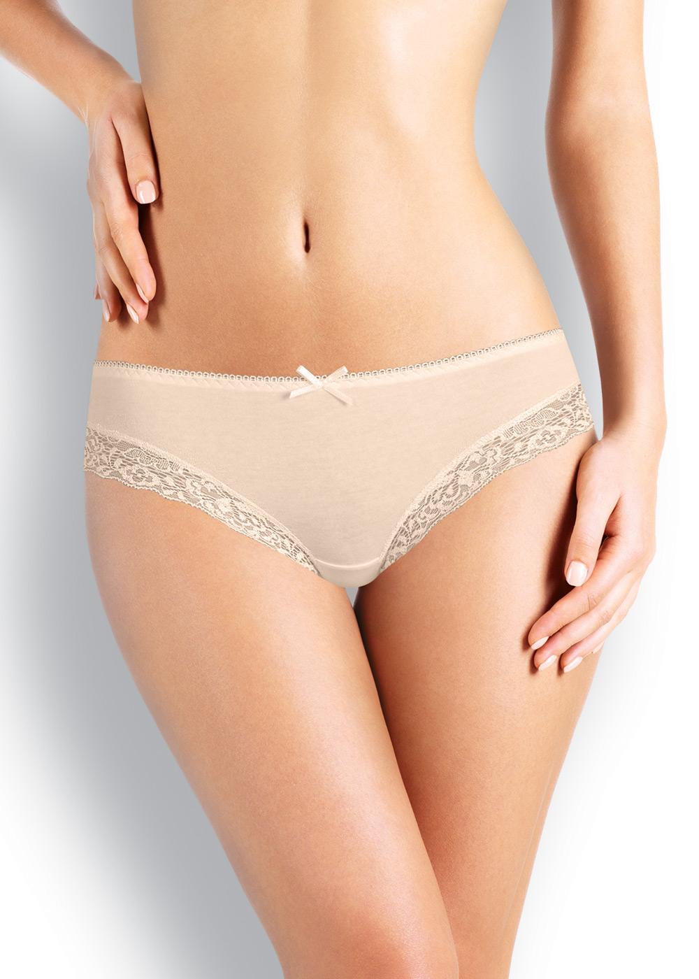 Трусы бикини женские из эластичного хлопкового полотна. Обработка краев по талии - ажурная резинка с фестоном, по ноге - вставки из кружева. Спереди бант.