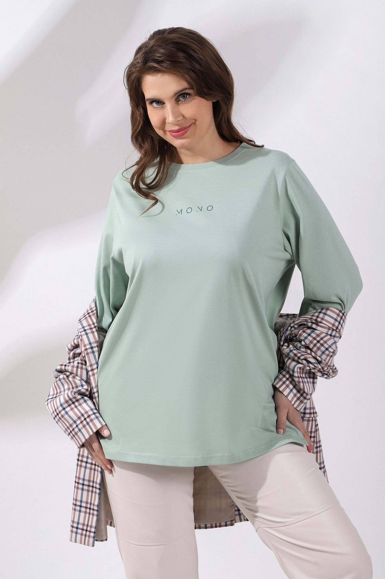 Блуза женская из гладкокрашеного тканого штапельного полотна, прямого силуэта, с горловиной овальной формы и цельнокроеными рукавами. Горловина окантована основным материалом, в боковых швах разрезы.
